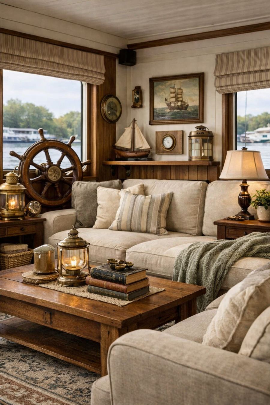 Stepping inside, the living area welcomes you with its warm and inviting atmosphere. Soft, plush furnishings in muted tones create a cozy environment, accented by vintage-inspired decor that offers a touch of nostalgia. The large windows allow natural light to flood the space, creating a bright and airy feel while offering stunning views of the surrounding water. Nautical elements, such as an antique ship's wheel and maritime-themed artwork, are tastefully incorporated, tying the theme of the houseboat together beautifully.