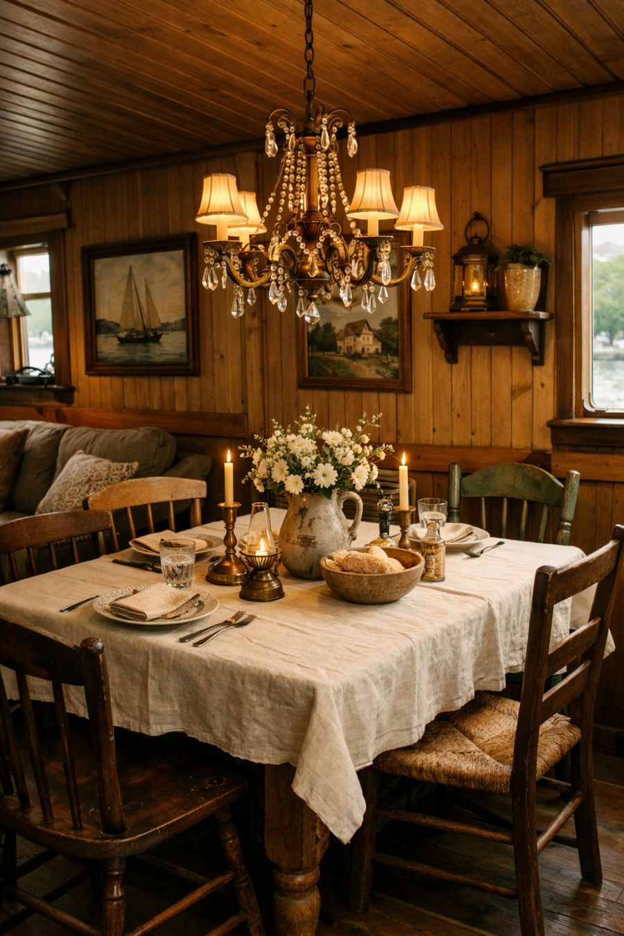 The dining area, adjacent to the living room, exudes rustic charm with a beautifully aged wooden dining table as its centerpiece. Surrounded by mismatched vintage chairs, the table is set beneath a quaint chandelier that adds a touch of elegance to the space. Soft lighting and a simple, white tablecloth create an atmosphere that's perfect for intimate dinners or lively family gatherings. The walls are adorned with quaint, country-style artwork, enhancing the cottage-like feel and making every meal feel like a special occasion.