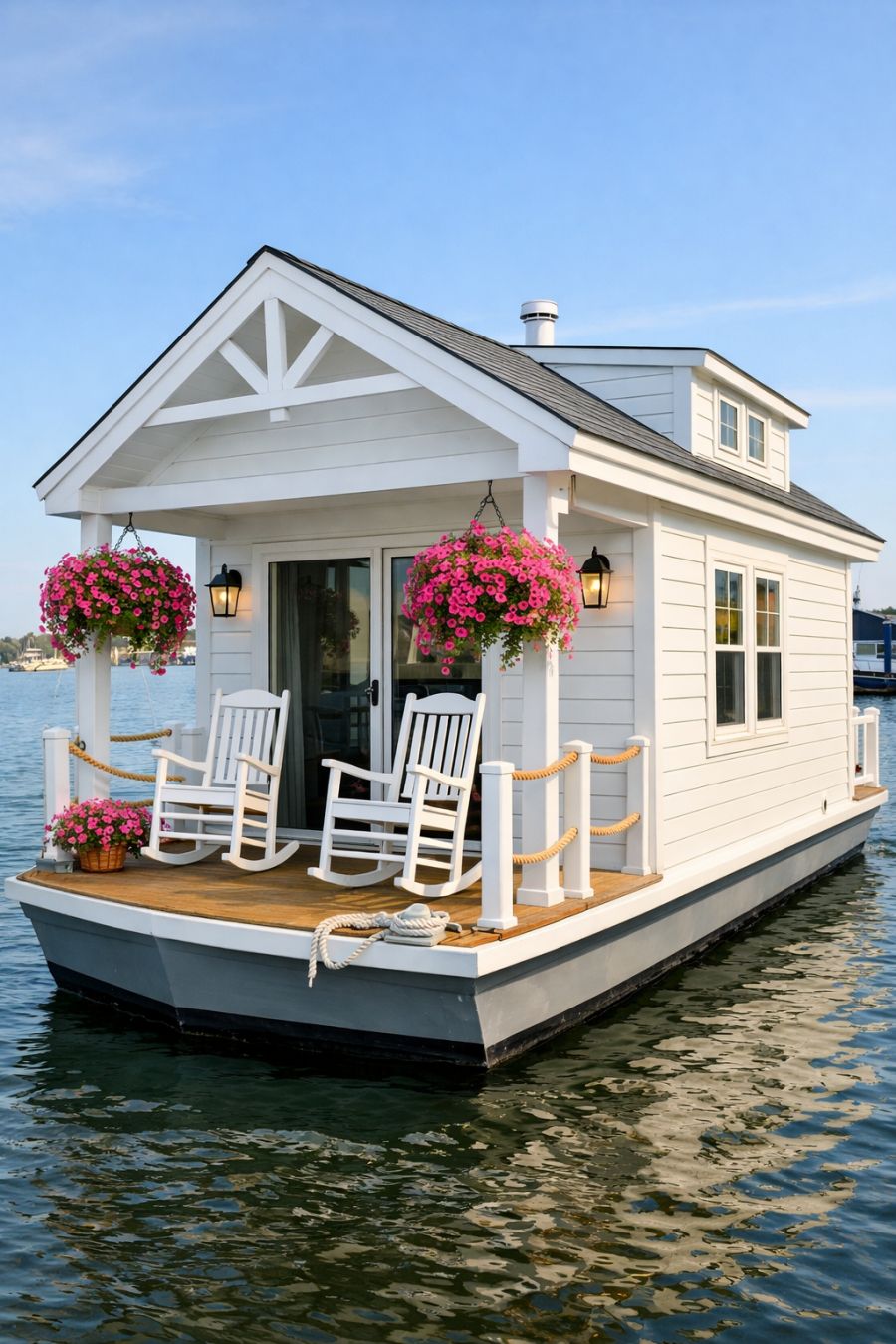 The exterior of this charming houseboat is a vision in bright white shiplap, capturing the essence of seaside simplicity. From a 3/4 angled perspective, the houseboat reveals its inviting covered front deck, where vibrant pink petunias cascade from hanging baskets, adding a splash of color against the pristine facade. Two classic white rocking chairs sit on the deck, inviting residents and guests alike to enjoy tranquil moments by the water. The overall look is that of a cozy, floating cottage, perfectly blending traditional appeal with a maritime setting.
