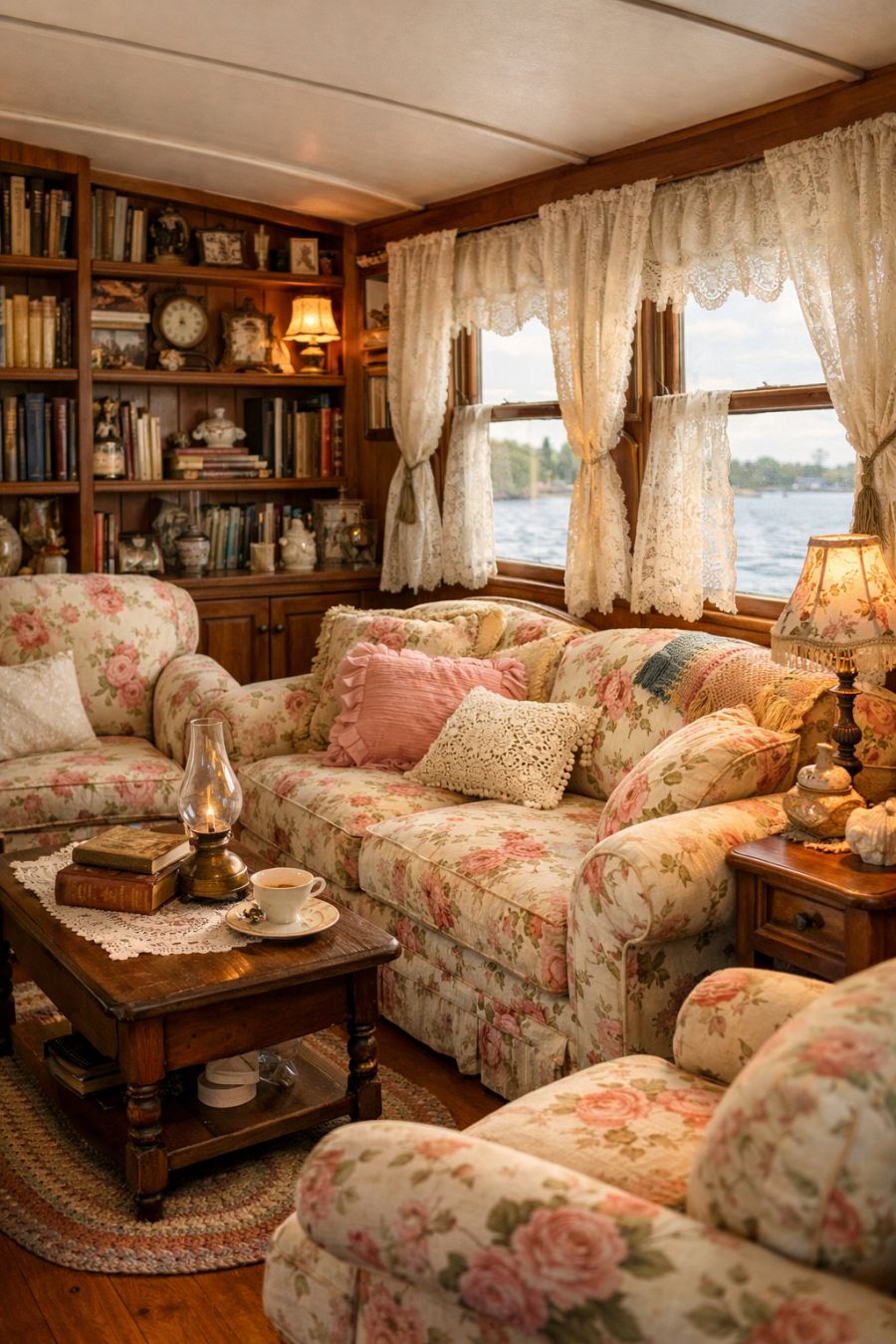 Upon entering the houseboat, you're greeted by a living area that feels like a warm embrace. The space is adorned with soft, overstuffed furniture draped in floral-patterned fabrics, reminiscent of a beloved grandmother's parlor. Hardwood floors add a touch of elegance, while the walls are lined with built-in bookshelves filled with well-thumbed novels and trinkets from yesteryear. Large windows allow natural light to flood the room, highlighting the delicate lace curtains that frame each view of the surrounding water. It's an environment that invites relaxation and reflection, offering a perfect blend of comfort and style.