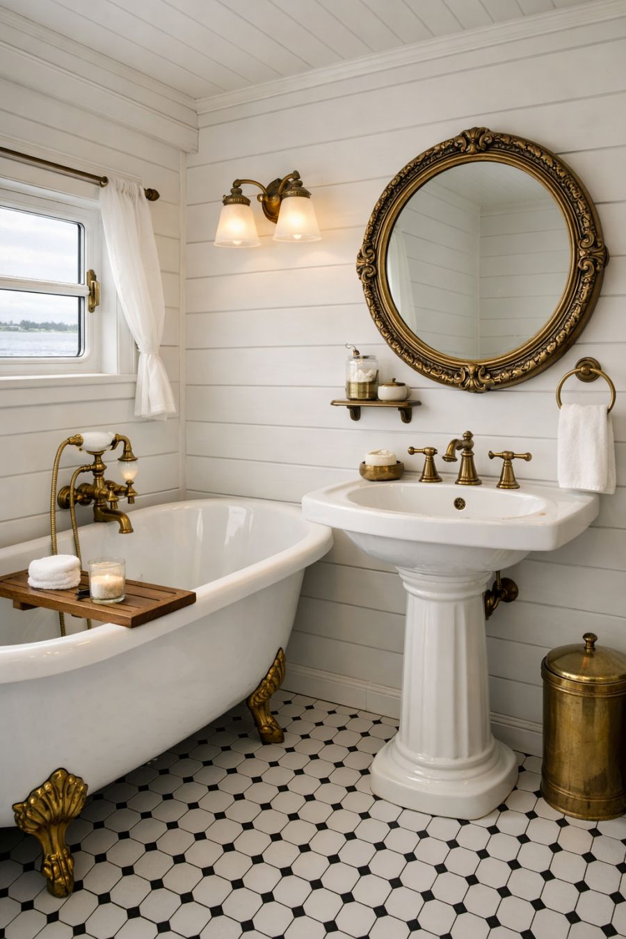 The bathroom continues the theme of vintage charm with modern convenience. It features a classic clawfoot tub, perfect for leisurely soaks, set against a backdrop of white shiplap walls. The hexagonal tile flooring adds a touch of vintage style, while a pedestal sink and a round mirror with an ornate frame enhance the room's quaint appeal. Brass fixtures provide a warm contrast to the cool, airy palette, and a small window invites natural light to create a serene and refreshing atmosphere. The layout is efficient yet stylish, offering a perfect balance of form and function.