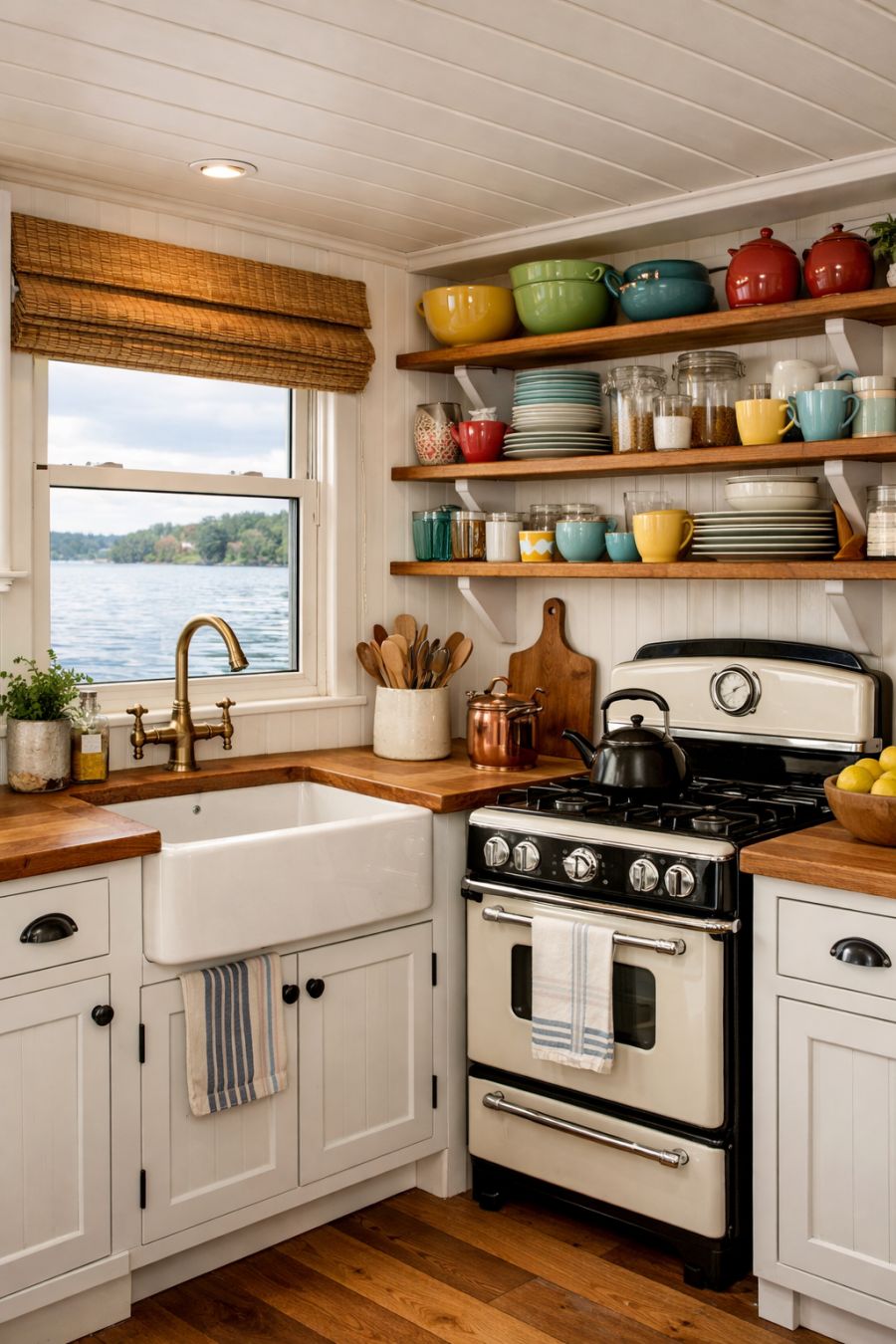 The kitchen is a delightful blend of practicality and charm, featuring classic white cabinetry and open shelving that display an array of colorful dishware. A farmhouse sink and an antique-style stove serve as focal points, paying homage to traditional design while offering modern functionality. The countertops are made of natural wood, adding warmth and texture to the space. A window above the sink offers views of the water, creating a serene backdrop for culinary endeavors and making this kitchen as inspiring as it is functional.