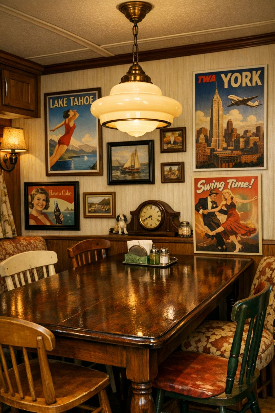 The dining area continues the theme of nostalgic elegance, with a dining table that seems to have been plucked straight out of a 1940s catalog. The tabletop is a beautiful dark wood, polished to perfection, and surrounded by mismatched chairs that add character and charm. Above the table hangs a retro pendant light, its curvy design reminiscent of the era it celebrates. The walls are adorned with vintage posters and artwork, creating an eclectic gallery that tells stories of a bygone time. The space is both vibrant and cozy, encouraging long meals and lively discussions.