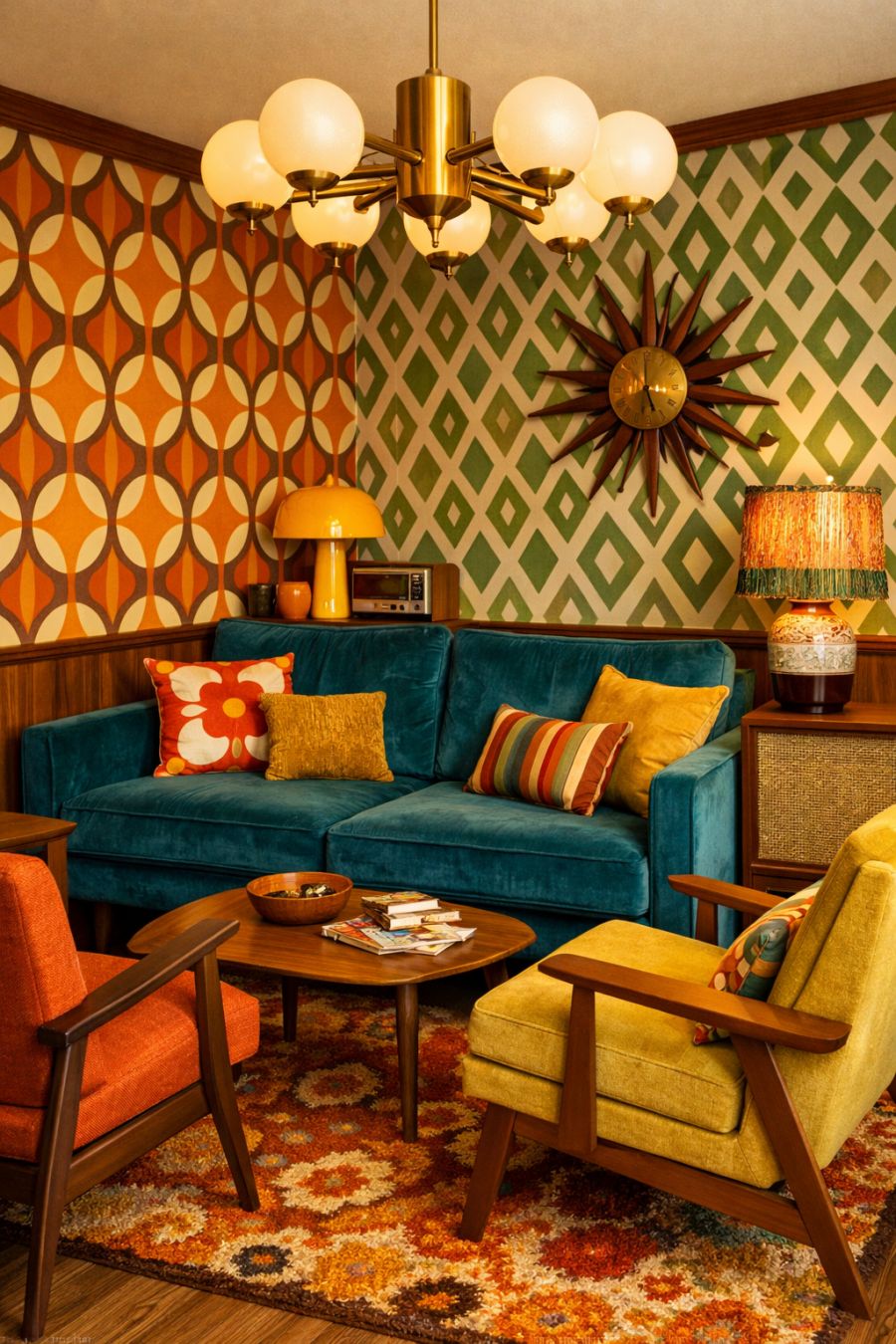 Stepping into the living area feels like a journey back in time, where vibrant hues and vintage patterns reign supreme. The walls are adorned with retro-inspired wallpaper, featuring bold geometric designs that instantly catch the eye. A plush, velvet sofa in a deep shade of teal anchors the space, inviting relaxation and conversation. Mid-century modern chairs, with their sleek lines and colorful upholstery, add a touch of sophistication and fun. The room is illuminated by a statement chandelier, its brass accents gleaming warmly, casting a nostalgic glow that enhances the overall ambiance.