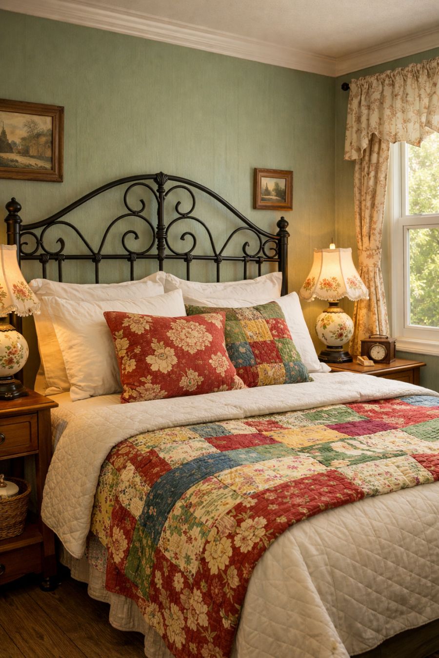 In the bedroom, a sense of tranquility and nostalgia blend seamlessly, creating a cozy retreat from the outside world. The centerpiece is a wrought iron bed frame, its intricate scrollwork harkening back to a more romantic era. Crisp white linens are accented with vibrant quilts and throw pillows, adding layers of texture and color. Vintage lamps with delicate floral patterns sit atop wooden bedside tables, casting a soft, soothing glow. The walls, painted a gentle sage green, provide a calming backdrop, while a large window bathes the room in natural light, enhancing its inviting atmosphere.