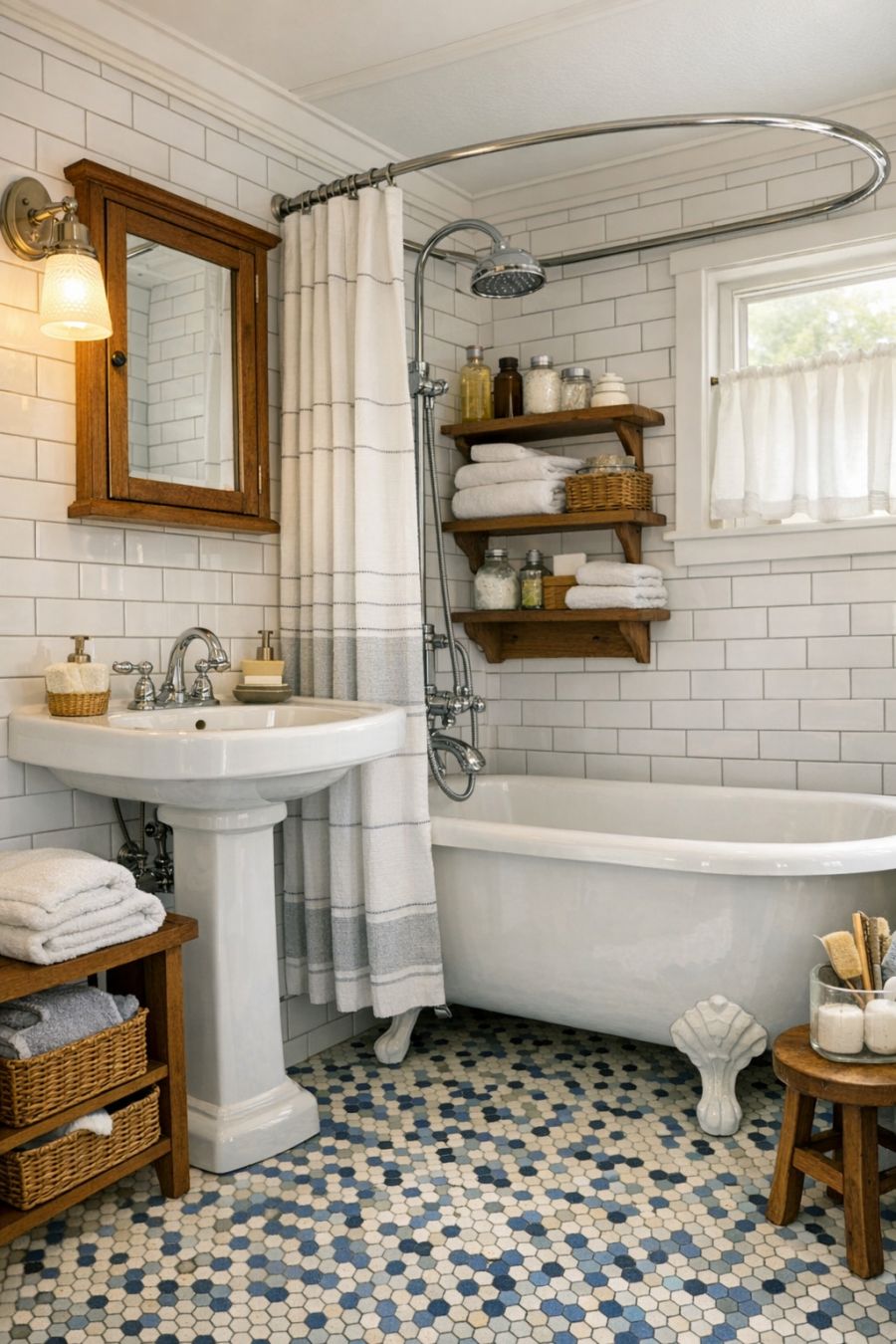 The bathroom is a charming blend of vintage aesthetics and modern functionality. White subway tiles line the walls, complemented by a classic clawfoot tub that invites relaxation. The floor features a mosaic tile pattern in shades of blue and white, adding a playful touch to the otherwise subdued color scheme. A pedestal sink with chrome fixtures evokes a sense of timeless elegance, while open shelving provides ample storage for essentials. The space is well-lit, with a mix of natural and artificial lighting, ensuring both style and practicality in this thoughtfully designed area.