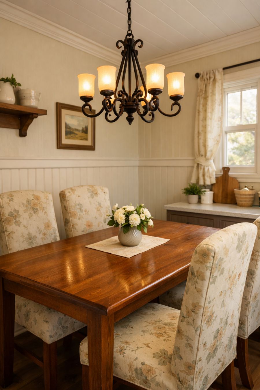 The dining area seamlessly blends classic charm with modern functionality, creating a space that is both beautiful and practical. A handcrafted wooden table, polished to perfection, takes center stage, surrounded by high-backed chairs upholstered in a muted floral fabric. Above, a wrought iron chandelier adds a touch of elegance, casting a warm glow that enhances the room's inviting ambiance. The walls are adorned with delicate wainscoting, which, paired with the soft color palette, creates a sense of harmony and balance, making every meal feel like a special occasion.