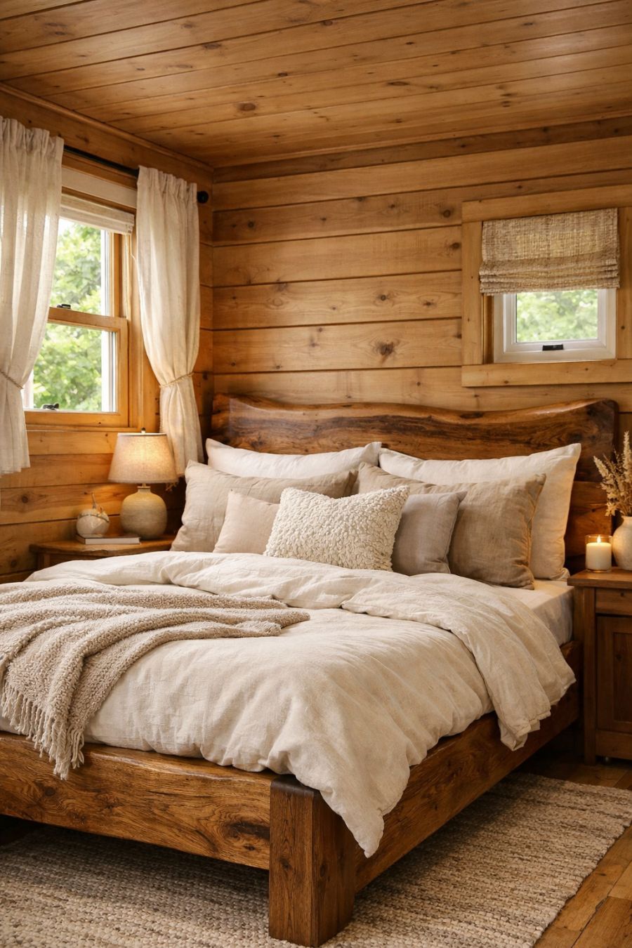 The bedroom is a haven of tranquility, designed to offer rest and rejuvenation. Soft, neutral tones create a calming atmosphere, while the centerpiece, a handcrafted wooden bed, exudes both strength and elegance. Luxurious linens and plush pillows add layers of comfort, inviting restful slumber. Natural light filters through the carefully placed windows, highlighting the intricate wood paneling that lines the walls and ceiling. Every element in the room is thoughtfully curated to enhance the sense of peace and serenity, making it the perfect retreat after a long day.
