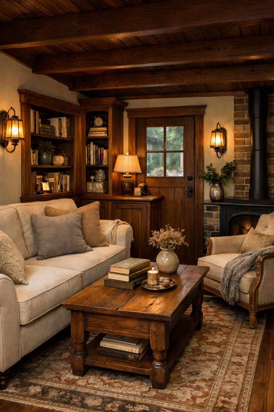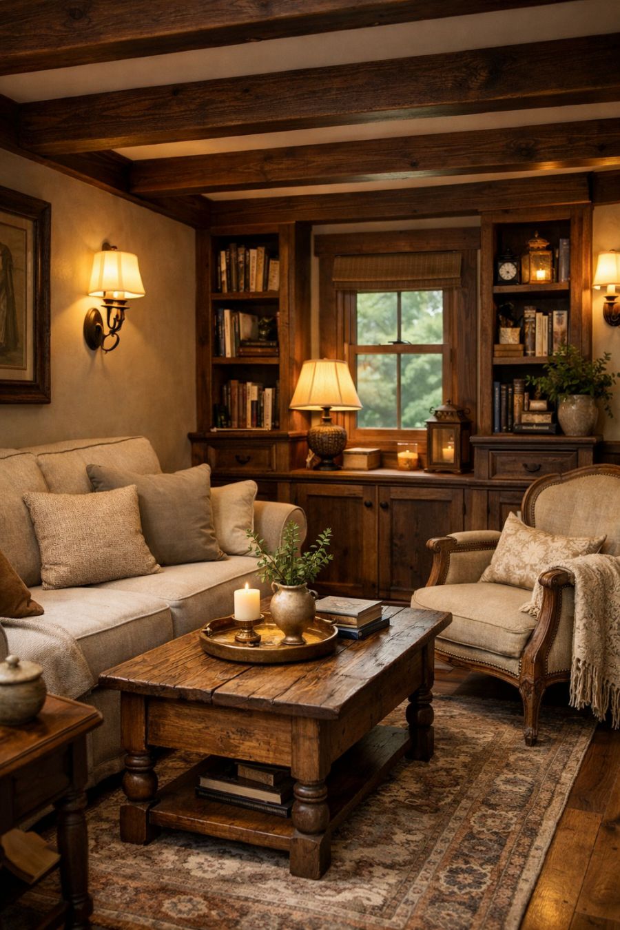 Upon entering the living area, you're enveloped in an atmosphere of understated elegance and coziness. Rich, dark wood beams stretch across the ceiling, complementing the custom woodwork that frames the windows and doorways. Plush, neutral-toned upholstery and vintage-inspired furnishings create an inviting space to relax and unwind. The room is thoughtfully lit with a combination of soft ambient lighting and strategically placed sconces, highlighting the intricate craftsmanship of the built-in bookshelves and accent pieces that complete the sophisticated yet comfortable setting.