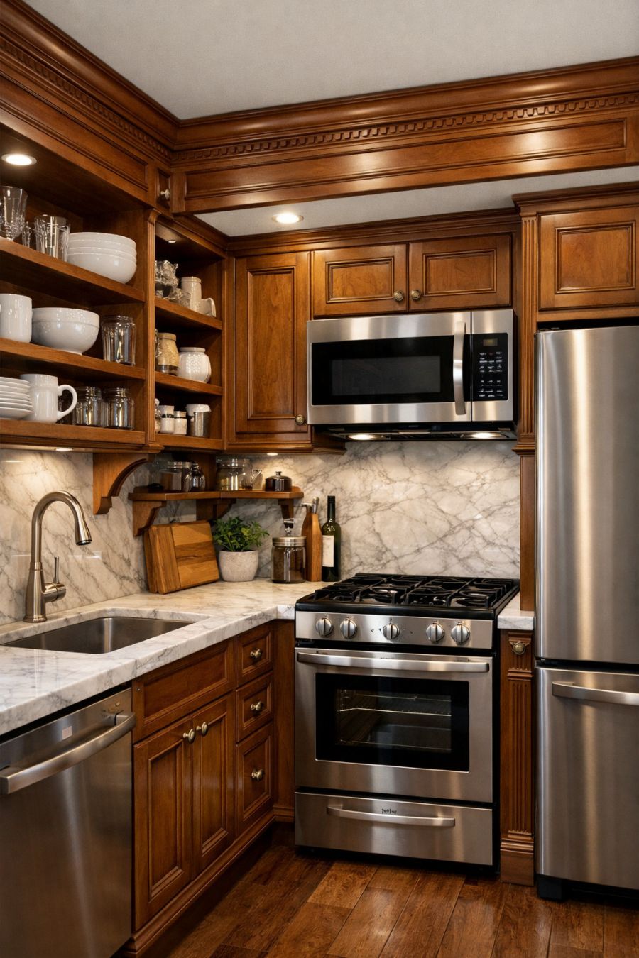In the kitchen, the artistry of custom woodwork continues to shine through in the detailed cabinetry and elegant trim. The counters are made of polished marble, providing a sleek surface that contrasts beautifully with the warm tones of the wood. Open shelving allows for both practicality and display, showcasing carefully selected dishware and glassware. State-of-the-art appliances are seamlessly integrated into the design, ensuring that the space is as functional as it is beautiful, while the overall layout promotes efficient workflow and ease of use.