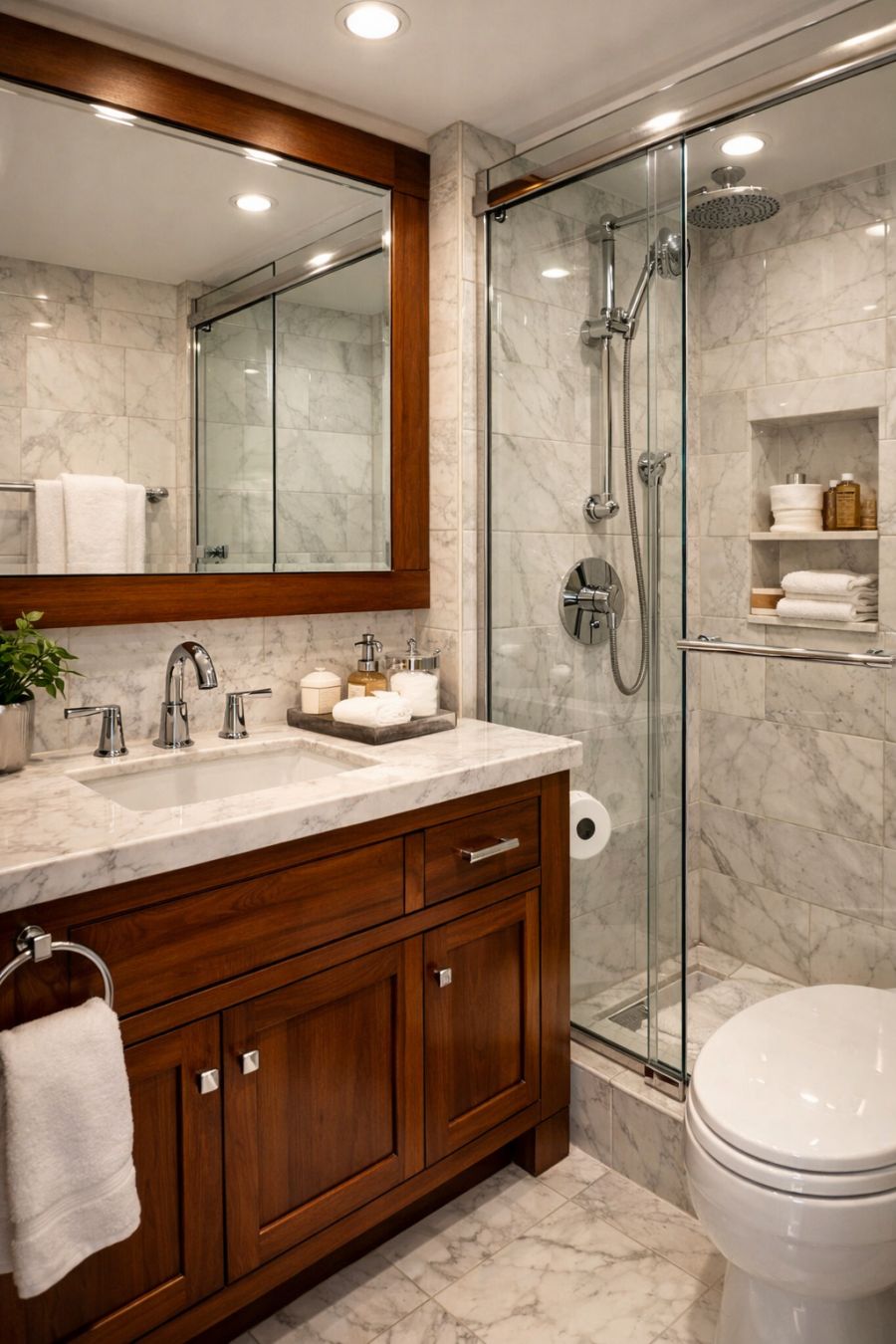 The bathroom is a study in elegance and functionality, with every detail thoughtfully considered to enhance the user experience. Gleaming marble tiles line the floor and walls, creating a sense of luxury and cleanliness. The vanity, crafted from rich wood, features a polished stone countertop and sleek fixtures that offer both style and practicality. A large mirror above the vanity reflects natural light, enhancing the room's brightness and spacious feel. The shower area, enclosed with clear glass panels, provides a modern touch, while maintaining the overall classic aesthetic of the space.