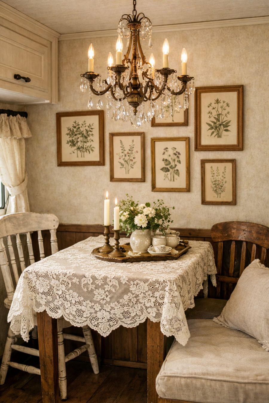 The dining area continues the theme of rustic elegance, featuring a small wooden table surrounded by mismatched chairs that add character and charm. A delicate lace tablecloth drapes over the table, setting the stage for intimate meals. Above, a vintage chandelier with crystal droplets casts a gentle glow, enhancing the room's romantic ambiance. The walls are adorned with quaint botanical prints, tying the dining space seamlessly into the overall garden-inspired design.