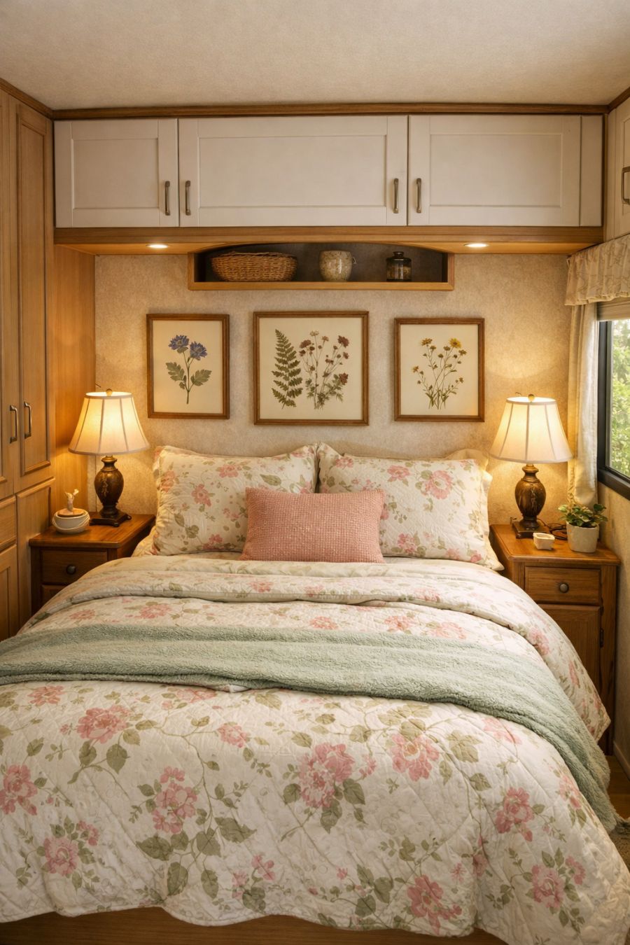 The bedroom exudes a sense of tranquility and comfort, with a palette of soft pastels and natural textures. A cozy double bed dressed in floral linens takes center stage, flanked by bedside tables with antique lamps. The walls are adorned with framed pressed flowers, adding a personal touch and connecting the indoor space to the lush exterior. Ample storage is cleverly integrated into the design, with built-in wardrobes that blend seamlessly into the decor, ensuring the space remains uncluttered and serene.