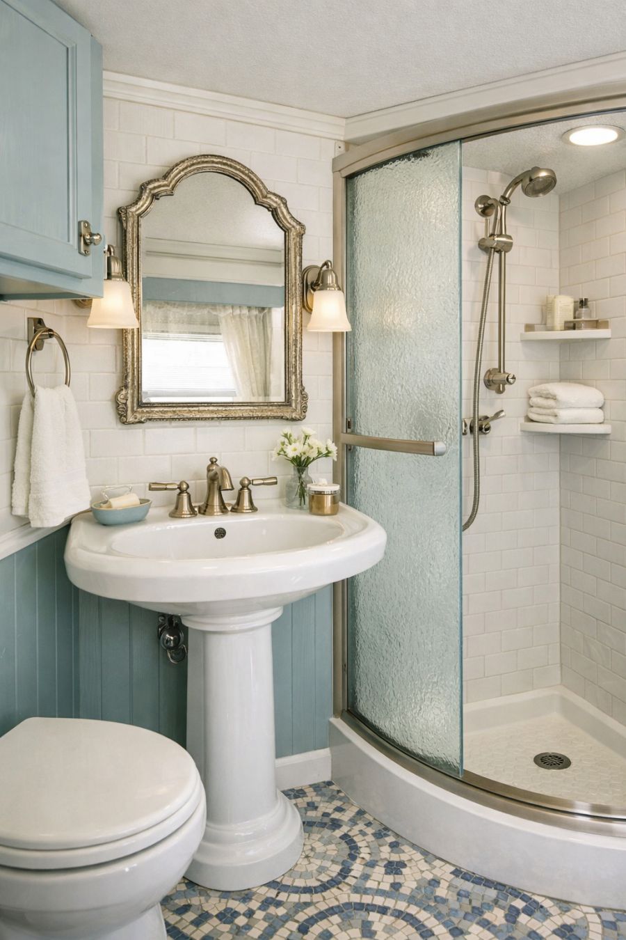 The bathroom is a study in compact elegance, featuring a soft white and pale blue color scheme that echoes the tranquility of a country spa. A pedestal sink sits beneath a vintage mirror, providing a touch of old-world charm. The shower area is enclosed with frosted glass, offering privacy while maintaining an open feel. Fixtures are finished in brushed nickel, complementing the classic subway tile walls and the intricate mosaic floor tiles that add a touch of artistic flair to the room.
