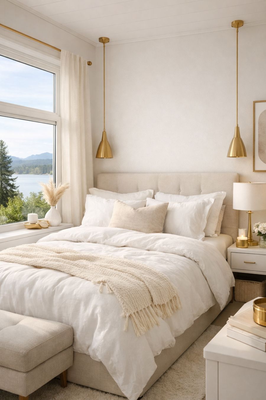 The bedroom is a serene sanctuary designed for rest and relaxation. The walls, adorned with soft white tones, create a tranquil atmosphere, while large windows offer stunning views and an abundance of natural light. A luxurious bed with plush linens takes center stage, complemented by minimalist furniture that emphasizes the room's open and airy feel. Gold accents throughout the room add a touch of sophistication, ensuring the space feels both elegant and inviting.