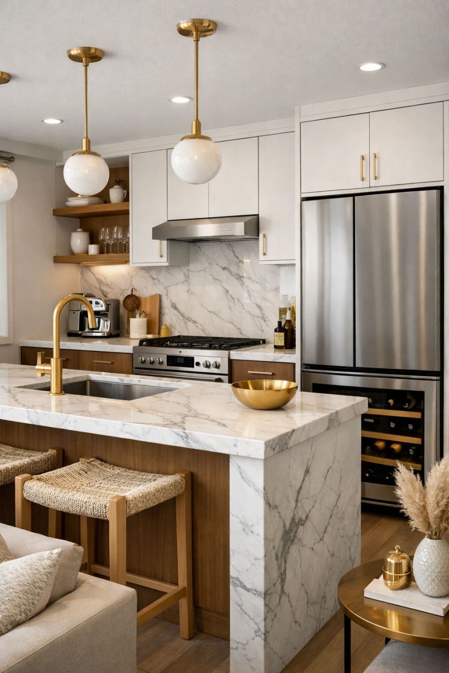 The kitchen is a masterpiece of modern design, featuring high-end finishes that combine luxury with practicality. White marble countertops provide ample space for meal preparation, while state-of-the-art appliances are seamlessly integrated into the cabinetry. Gold fixtures and hardware add an elegant touch, highlighting the attention to detail in the design. The open layout ensures the kitchen flows naturally into the living and dining areas, making it perfect for entertaining.