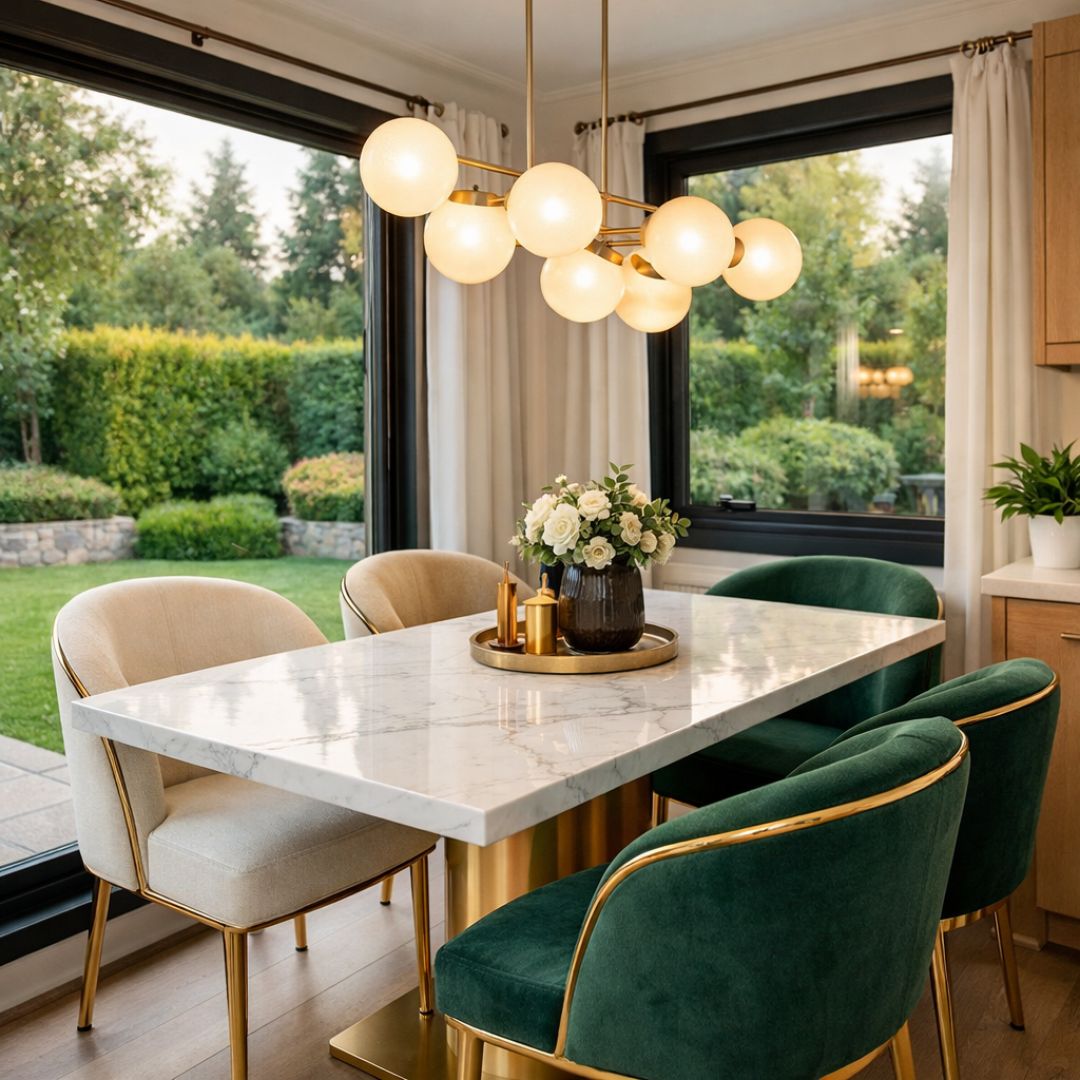 The dining area is an intimate yet elegant space designed for both functionality and style. A sleek, white marble table takes center stage, surrounded by gold-accented chairs that add a touch of glamour. The minimalist design is enhanced by a statement light fixture, which casts a warm glow over the area, creating a cozy ambiance for dining. Large windows continue to offer stunning views of the manicured garden, making every meal a serene experience.