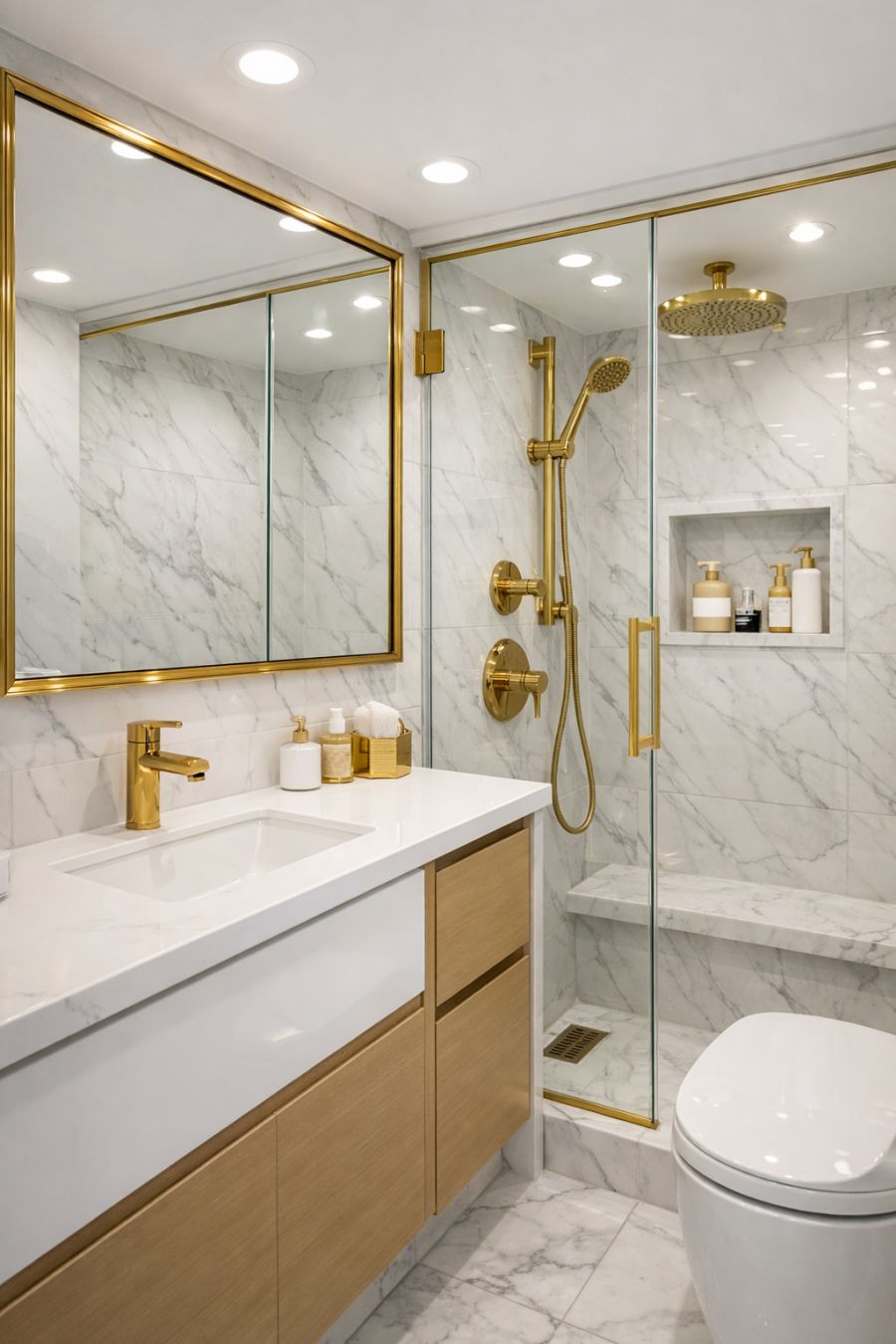 The bathroom in this tiny home exudes elegance and functionality. The walls and floors are clad in pristine white marble, creating a seamless and luxurious aesthetic. A large mirror with gold trim reflects light and enhances the sense of space, while modern fixtures in a matching gold finish add a touch of glamour. The layout is thoughtfully designed to maximize efficiency without compromising on style, featuring a sleek vanity and a spacious shower that ensures a relaxing experience.