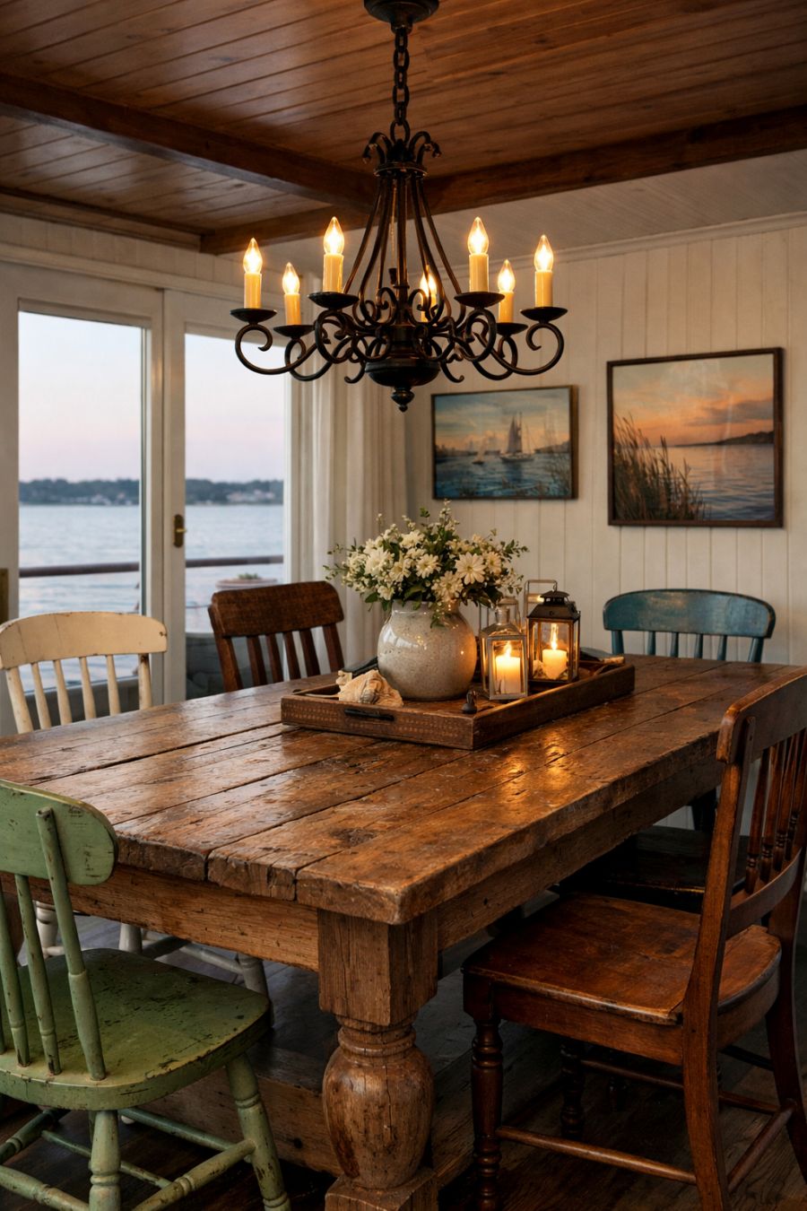The dining area continues the theme of open, airy spaces with a large, reclaimed wood table that serves as the room's focal point. Surrounded by mismatched vintage chairs, the setup evokes a sense of casual elegance and familial warmth. Overhead, a wrought-iron chandelier adds a touch of rustic charm, casting gentle light across the room. The walls are adorned with simple, tasteful art pieces that reflect the natural beauty of the surrounding water, tying the indoor and outdoor elements together in perfect harmony.