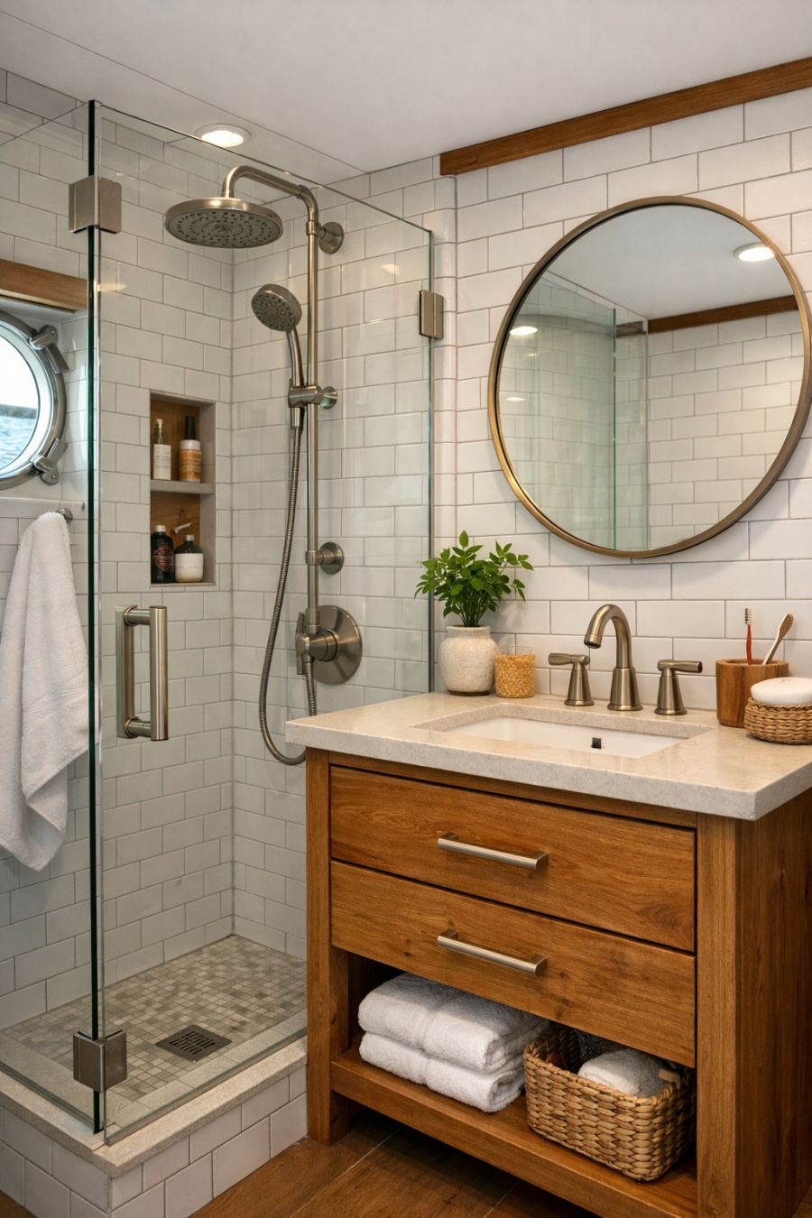 The bathroom combines functionality with style, featuring a walk-in shower with glass doors that enhance the room's openness. Subway tiles in a classic white hue line the walls, while a wooden vanity adds warmth to the otherwise crisp aesthetic. Modern fixtures in brushed nickel provide a sleek contrast, and a circular mirror above the sink adds a touch of elegance. The use of natural materials and a neutral color scheme creates a calming atmosphere, perfectly suited for a rejuvenating start or end to the day.