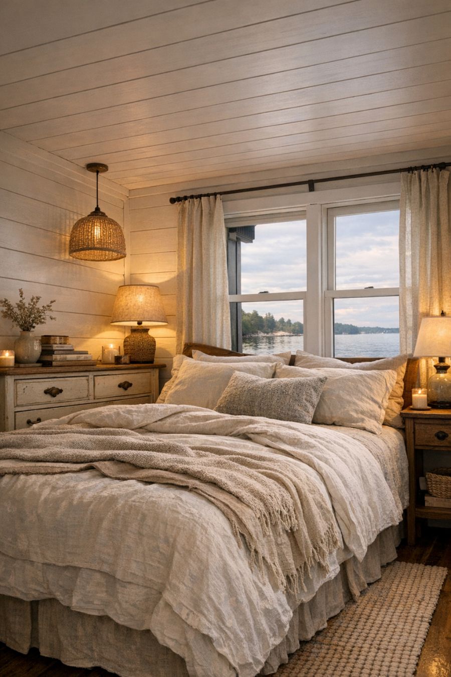 The bedroom offers a serene retreat, with its soft, neutral color palette and cozy textures. A plush queen-sized bed is the centerpiece, dressed in layers of linen and cotton for a touch of rustic luxury. The walls are adorned with shiplap, providing a subtle nod to farmhouse design, while large windows offer stunning views of the water, making waking up a truly refreshing experience. Thoughtful touches like a vintage-inspired dresser and soft ambient lighting complete the space, creating a tranquil haven for rest and relaxation.