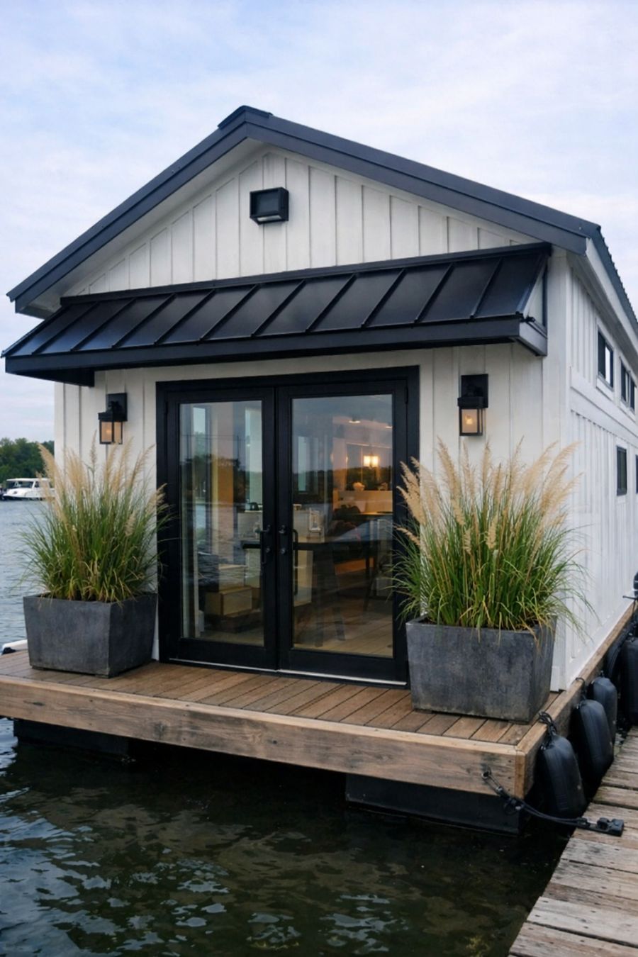 The exterior of this houseboat is a striking blend of classic farmhouse charm and contemporary design elements. The whitewashed board and batten siding exudes a sense of warmth and simplicity, perfectly complemented by a sleek black metal awning that adds a touch of modern sophistication. Large planters brimming with tall ornamental grasses frame the glass entryway, creating a natural and inviting transition from the dock to the interior. Captured in an amateur photograph at a 3/4 angle, the houseboat's facade showcases a meticulous attention to detail that makes it a standout presence on the water.