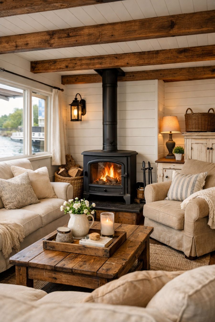 Stepping inside, the living area greets you with an abundance of natural light streaming through large windows, highlighting the crisp white walls and rustic wooden beams overhead. The open-air concept is immediately apparent, with a layout that encourages a seamless flow between spaces. Comfortable, overstuffed couches invite relaxation, while a carefully curated selection of farmhouse-style furnishings adds a touch of nostalgia and warmth. The room's centerpiece is a wood-burning stove, providing both visual interest and a cozy ambiance on cooler evenings.