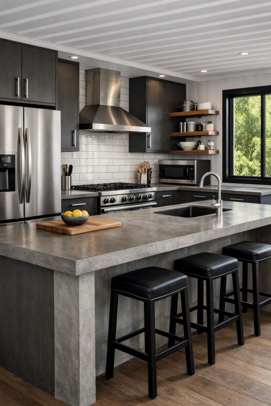 The kitchen area is a chef's dream, combining functionality with sleek design. Stainless steel appliances are seamlessly integrated into custom cabinetry, offering ample storage while maintaining a clean, uncluttered look. The countertops are durable concrete, providing a sturdy and stylish workspace. A large island serves as both a preparation area and a casual dining spot, with high stools for seating. Natural light floods the space through large windows, highlighting the harmonious blend of materials and creating a bright, airy atmosphere.