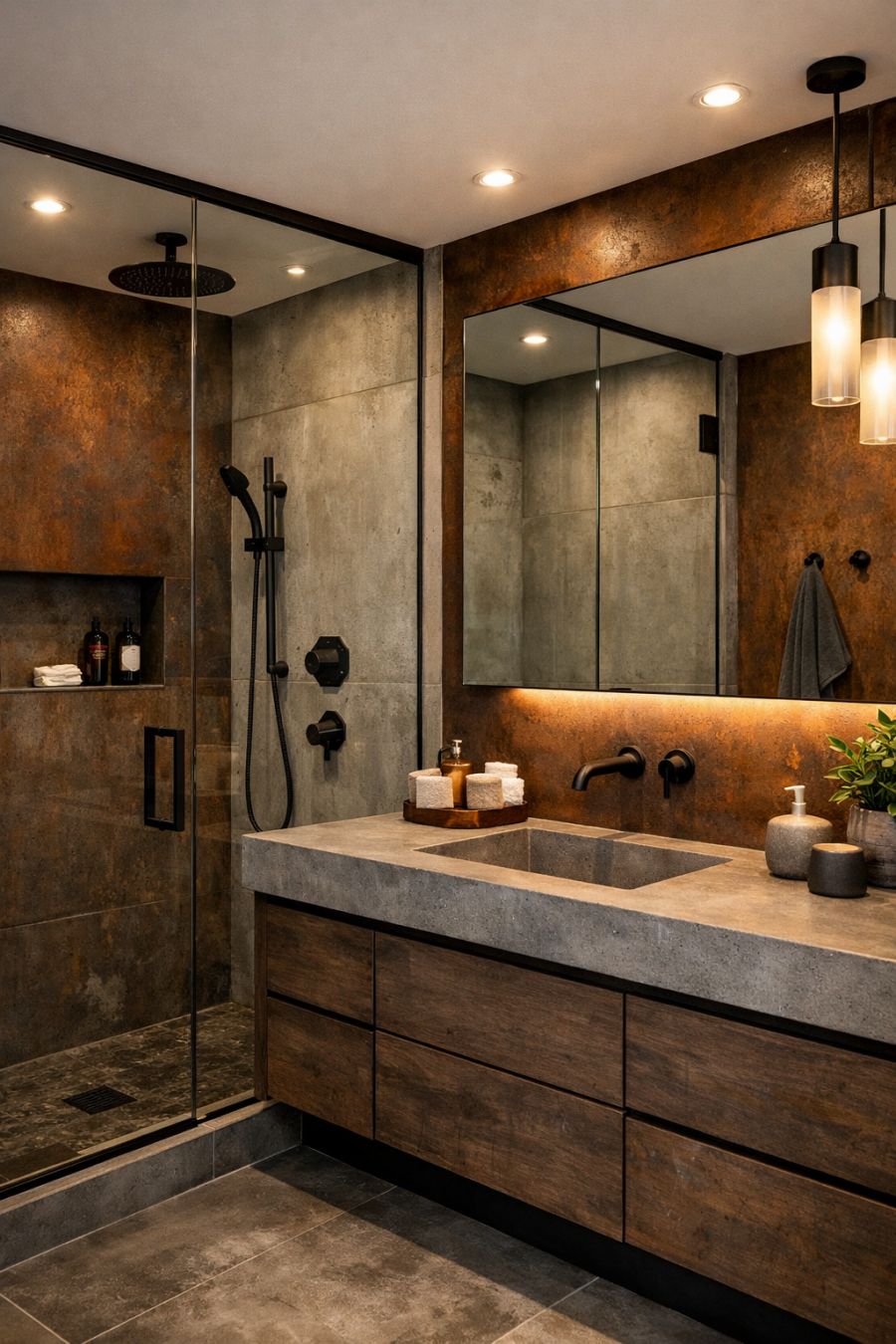 The bathroom is a sanctuary of modern design and functionality. Featuring durable materials like concrete and corten steel, the space is both stylish and low-maintenance. A large walk-in shower with a frameless glass enclosure serves as the focal point, while a sleek vanity with a concrete countertop offers ample storage and workspace. The color scheme is a soothing palette of earth tones, complemented by soft lighting that creates a spa-like ambiance. Every element is carefully chosen to enhance the room's practicality and aesthetic appeal.