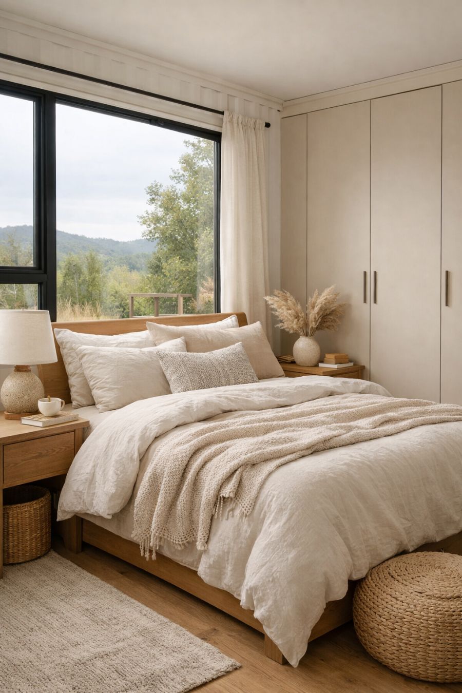 The bedroom is a serene retreat, designed to promote rest and relaxation. Soft, neutral tones dominate the space, with plush bedding and textiles adding layers of comfort. The room features large windows that frame views of the surrounding landscape, bringing the outdoors in. Simple, built-in wardrobes provide ample storage without detracting from the room's minimalist aesthetic. The design emphasizes clean lines and natural materials, creating a tranquil environment that invites peaceful slumber.