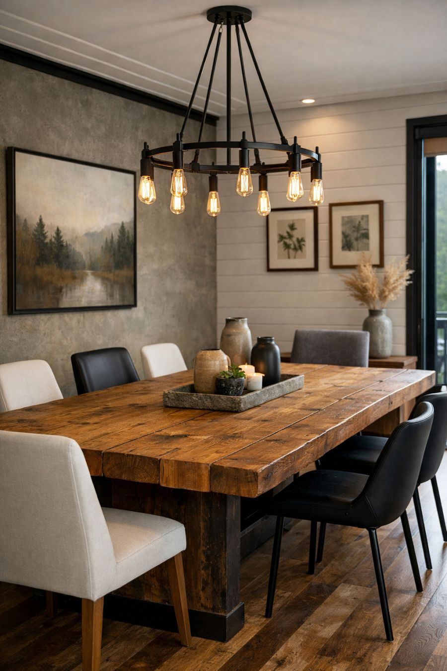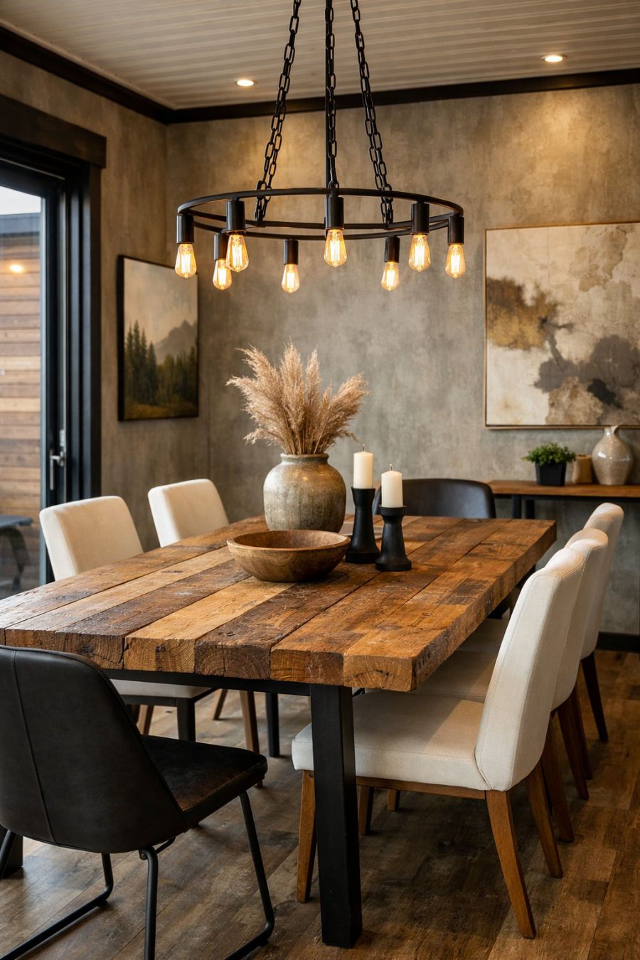 The dining area is a blend of rustic charm and modern elegance, featuring a large reclaimed wood table that serves as the centerpiece of the space. Surrounding the table are contemporary chairs with clean lines, offering comfort and style. The room is illuminated by an industrial-style chandelier, adding an artistic touch. Walls adorned with subtle artwork and textured finishes provide visual interest without overwhelming the simplicity of the design. This space is designed for intimate dinners and large gatherings alike, making it versatile and inviting.