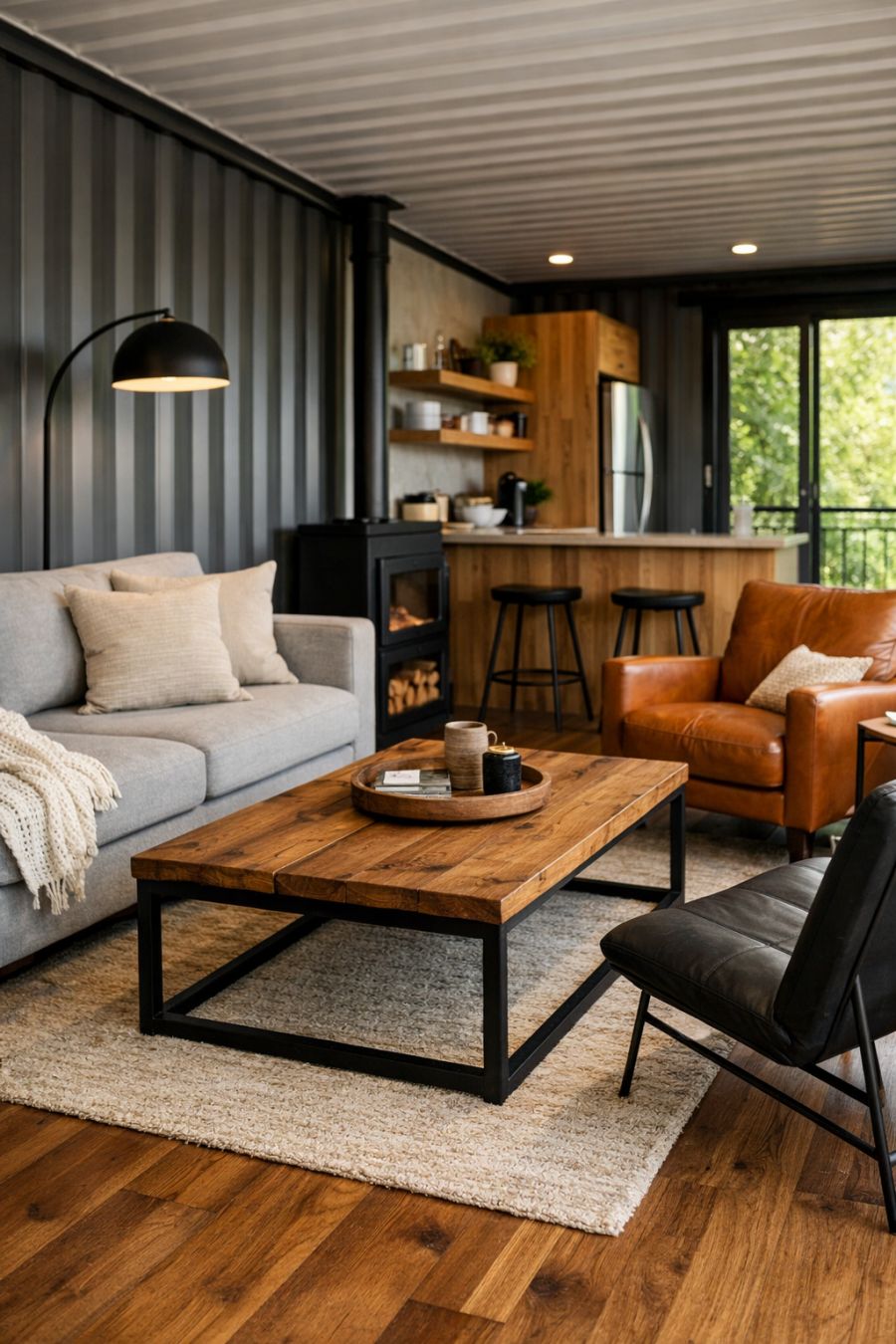 Upon entering the home, you are greeted by a spacious living area that exudes warmth and comfort. The interior design embraces a minimalist yet cozy aesthetic, with natural wood flooring that complements the industrial feel of the steel structure. Large windows allow for ample natural light, creating a bright and inviting atmosphere. The furnishings are a mix of plush sofas and sleek, modern pieces, arranged to encourage conversation and relaxation. An open floor plan ensures a seamless flow between the living area and the rest of the home, enhancing the sense of space and connectivity.