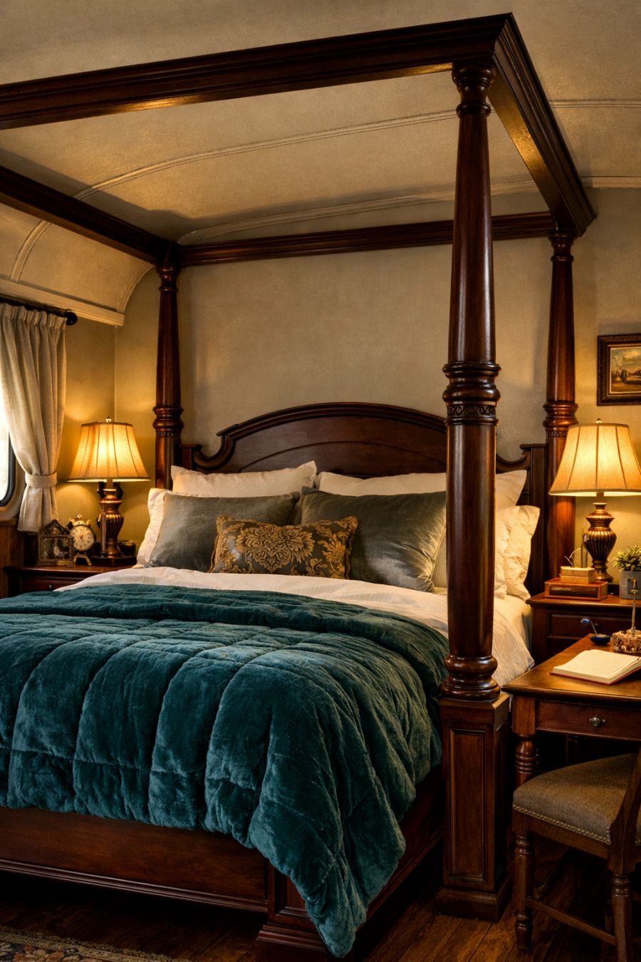 The bedroom offers a serene retreat, with a focus on comfort and style. A four-poster bed, crafted from dark mahogany, takes center stage, dressed in luxurious linens and a velvet quilt. The walls are painted in a soft, muted tone, providing a calming backdrop to the rich wood and textiles. Antique bedside tables hold vintage lamps that cast a gentle glow, creating a cozy atmosphere. A small writing desk tucked into the corner offers a quiet space for reflection, completing the room's restful ambiance.
