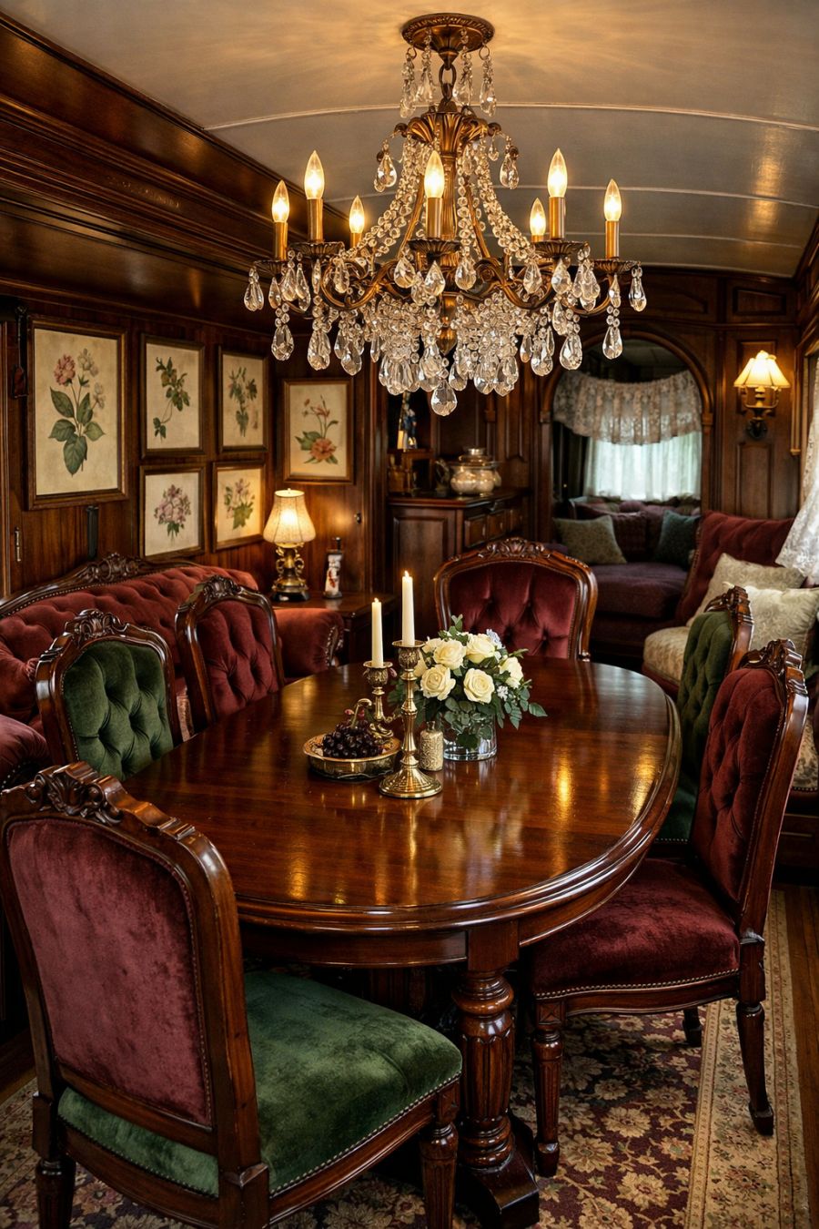 The dining area seamlessly blends into the living space, maintaining the Victorian theme with a large, mahogany dining table that can comfortably seat six. Elegant high-backed chairs upholstered in velvet provide a touch of luxury, inviting guests to linger over meals. A vintage chandelier hangs above, its crystal droplets catching the light and adding a touch of sparkle. The walls are adorned with antique botanical prints, offering a nod to the farmhouse’s connection to the natural world outside.