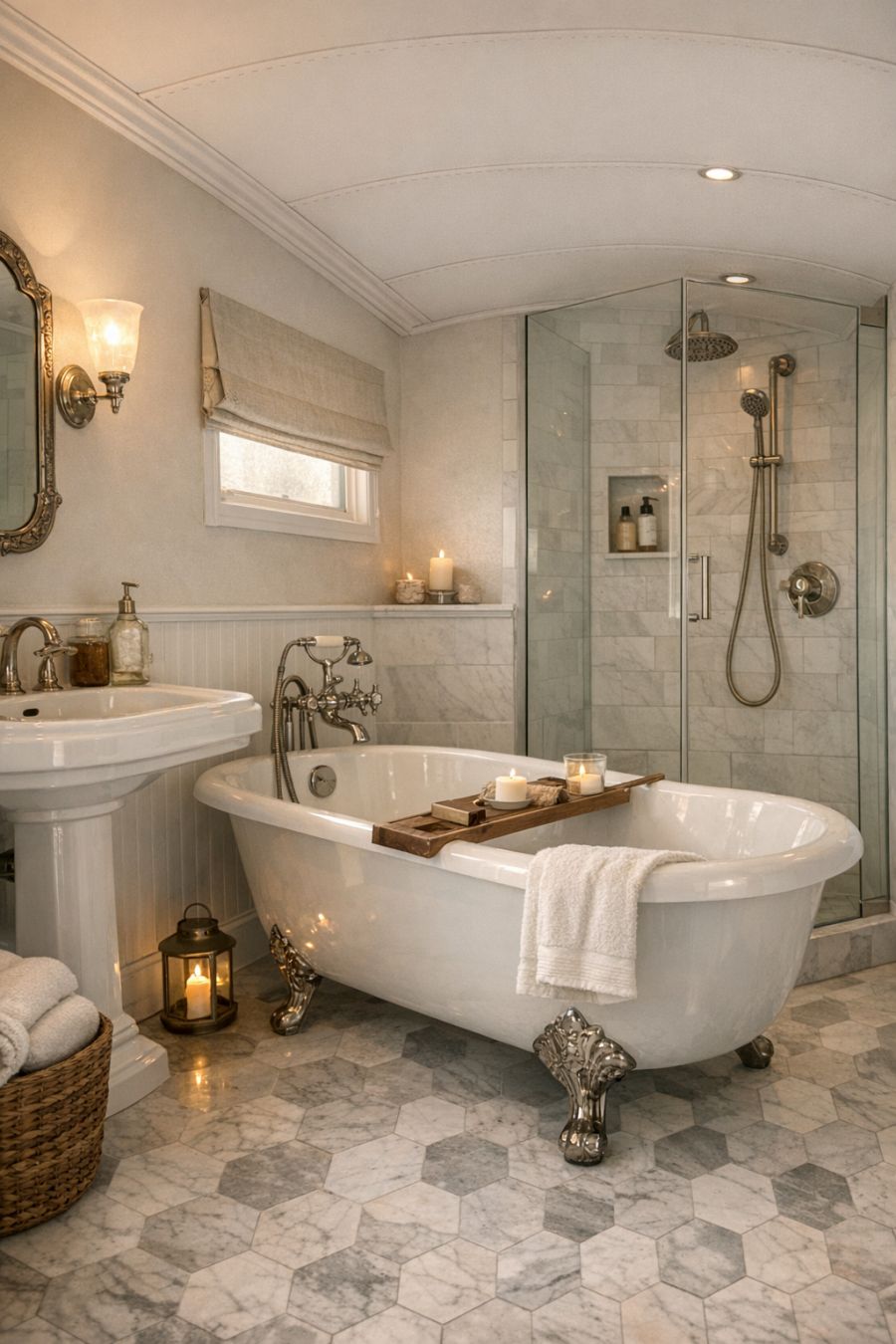 The bathroom is a sanctuary of relaxation, combining classic and modern elements for a truly unique space. The floor is laid with hexagonal marble tiles, their cool surface adding a touch of luxury. A clawfoot tub stands proudly in the center, offering a nod to the home’s historic influences. A vintage pedestal sink with polished nickel fixtures exudes timeless elegance, while a frameless glass shower enclosure adds a modern touch. Soft, ambient lighting and a muted color palette enhance the serene atmosphere, making this bathroom a perfect place to unwind.