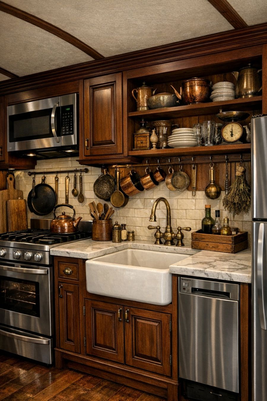 The kitchen is a masterful blend of old-world charm and modern convenience. Rich mahogany cabinetry offers ample storage, while sleek marble countertops provide a practical workspace. State-of-the-art stainless steel appliances are cleverly integrated, ensuring the kitchen remains functional without disrupting the historic aesthetic. A farmhouse sink with a vintage-style faucet provides a charming focal point, while open shelves display a curated selection of antique dishware and kitchen tools, adding character and warmth to the space.