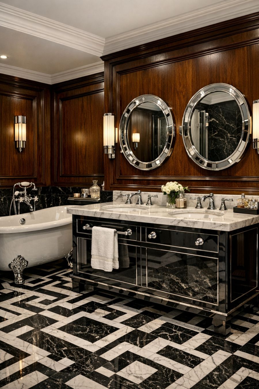 The bathroom is a testament to art deco luxury, featuring a harmonious blend of classic and contemporary elements. Glossy black and white tiles form geometric patterns on the floor, while the walls are accented with rich, dark wood paneling. A freestanding clawfoot tub sits regally at one end, complemented by polished chrome fixtures that gleam in the light. The vanity is a masterpiece of design, with a marble countertop and twin basins, each set beneath a stylish round mirror. This room offers a serene retreat, where functionality meets refined elegance, providing an atmosphere of relaxation and sophistication.