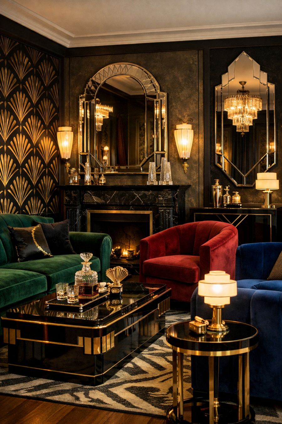 Stepping into the living area, you are immediately enveloped in the polished world of the 1920s art deco movement. Rich velvet furnishings in deep jewel tones dominate the space, inviting you to sink into their luxurious embrace. The walls are adorned with geometric patterns and elegant mirrors that catch the light, amplifying the grandeur of the room. Intricately designed lamps cast a warm glow over the space, highlighting the sleek lines of the furniture and the subtle opulence of the decor. It is a space that invites both relaxation and entertaining, with every element meticulously curated to transport you back to an era of glamour and sophistication.