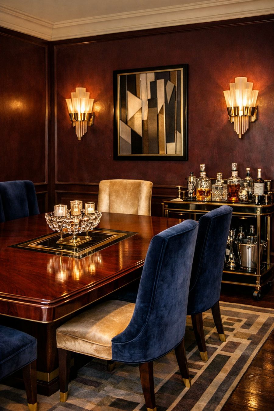 The dining area continues the theme of art deco elegance, with a stunning mahogany table as its centerpiece, surrounded by high-backed velvet chairs that promise comfort and style. The walls are dressed in a rich, deep hue, enhancing the intimate atmosphere while art deco sconces provide soft illumination. A vintage bar cart, polished to perfection, stands ready to serve as a conversation starter, offering a selection of fine spirits and glassware. This area is designed for both grand dinner parties and intimate family gatherings, a perfect blend of functionality and elegance that invites memorable dining experiences.