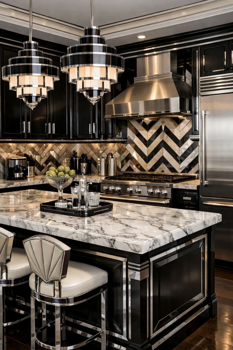 In the kitchen, the art deco influence is evident in the sleek, metallic finishes and bold, geometric patterns that define the space. Custom cabinetry in a glossy black finish provides ample storage, while chrome handles and fixtures add a touch of modernity. A large island with a marble countertop serves as both a practical workspace and a casual dining spot, illuminated by pendant lights with striking designs. State-of-the-art appliances are seamlessly integrated into the design, ensuring that the kitchen is as functional as it is stylish, a place where culinary creativity can flourish.