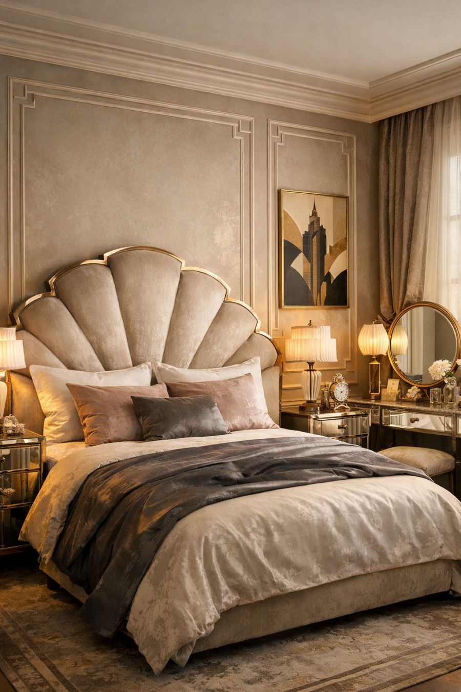 The bedroom is a sanctuary of elegance and comfort, where art deco style meets modern luxury. The focal point is a plush, velvet-upholstered bed, framed by sleek nightstands with mirrored surfaces that reflect the room's subtle palette. A vintage-inspired vanity sits by the window, offering a serene spot for morning routines under the soft glow of a retro-style lamp. The walls are adorned with tasteful artworks and decorative moldings that echo the geometric themes of the era. This is a space designed for rest and rejuvenation, exuding a timeless charm that invites peaceful slumber.
