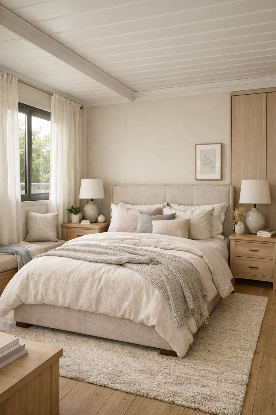 The bedroom is a sanctuary of tranquility, designed to offer the utmost comfort and relaxation. Soft, muted colors dominate the space, creating a calming atmosphere that promotes restful sleep. A plush bed, adorned with luxurious linens, serves as the centerpiece, flanked by matching nightstands that provide both style and functionality. The large windows are dressed with light, flowing curtains that filter the sunlight, bathing the room in a gentle glow. Thoughtful storage solutions, including a spacious wardrobe, ensure the room remains clutter-free, while personal touches like a cozy reading nook add to the inviting ambiance.