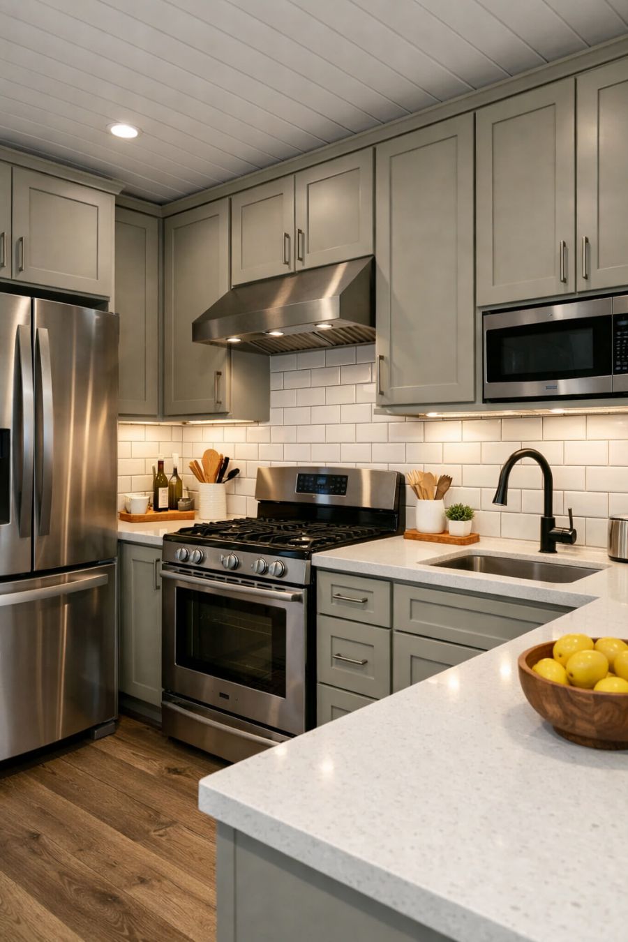 The kitchen embodies a perfect balance between style and practicality, catering to the needs of any culinary enthusiast. Featuring sleek cabinetry in a muted shade, the storage solutions are both ample and discreet, maintaining the clean lines of the design. Stainless steel appliances add a modern edge, while the subway tile backsplash provides a timeless appeal. The countertop, crafted from durable quartz, offers plenty of workspace for meal preparation, enhanced by under-cabinet lighting that ensures every task is performed with ease. Overall, the kitchen is a harmonious blend of contemporary elements and classic touches, designed for both efficiency and enjoyment.
