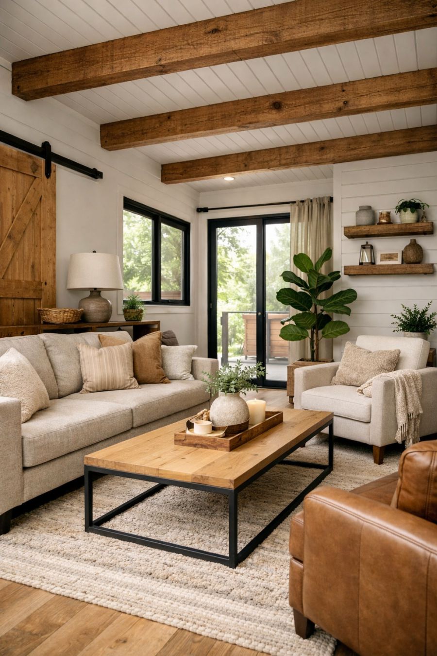Stepping inside, the living area greets you with a sense of warmth and openness, characterized by high ceilings and an abundance of natural light. The interior design leans towards a modern farmhouse style, with exposed wooden beams, neutral tones, and plush furnishings that invite comfort and relaxation. A tastefully arranged seating area centered around a minimalist coffee table provides the perfect spot for casual gatherings or simply unwinding with a good book. Thoughtful touches like a soft area rug and strategically placed potted plants enhance the cozy yet sophisticated ambiance of this inviting space.