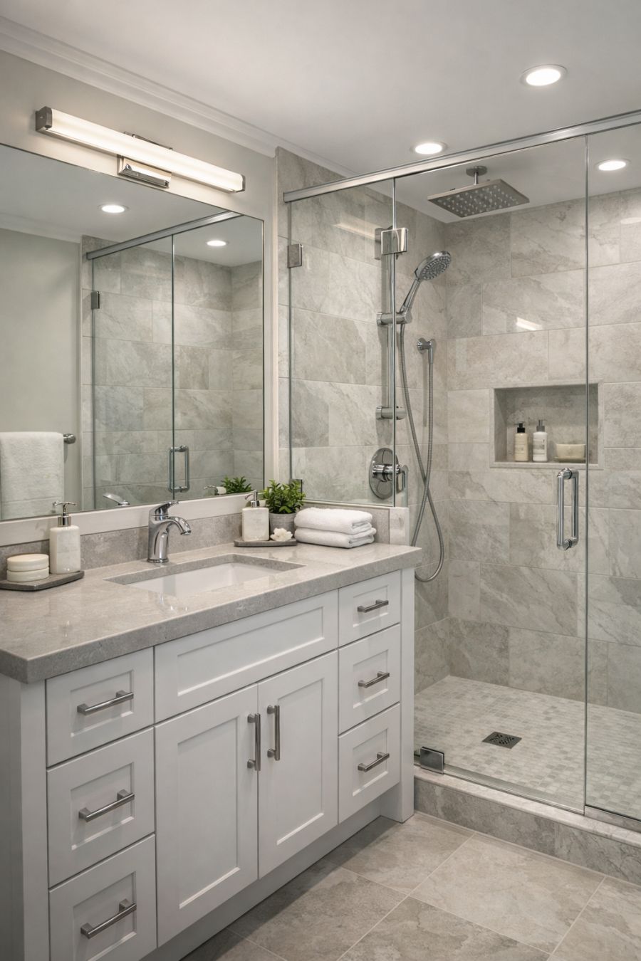 The bathroom is a study in elegance and functionality, with a design that prioritizes both aesthetics and practicality. The color scheme is a soothing blend of whites and soft grays, accented by natural stone tiles that add a touch of luxury. A modern vanity with ample storage is topped with a sleek countertop and an undermount sink, complemented by contemporary fixtures in a polished chrome finish. The walk-in shower, enclosed by clear glass panels, features a rainfall showerhead for a spa-like experience. Soft lighting and a large mirror enhance the sense of space and serenity, making the bathroom a peaceful retreat within the home.