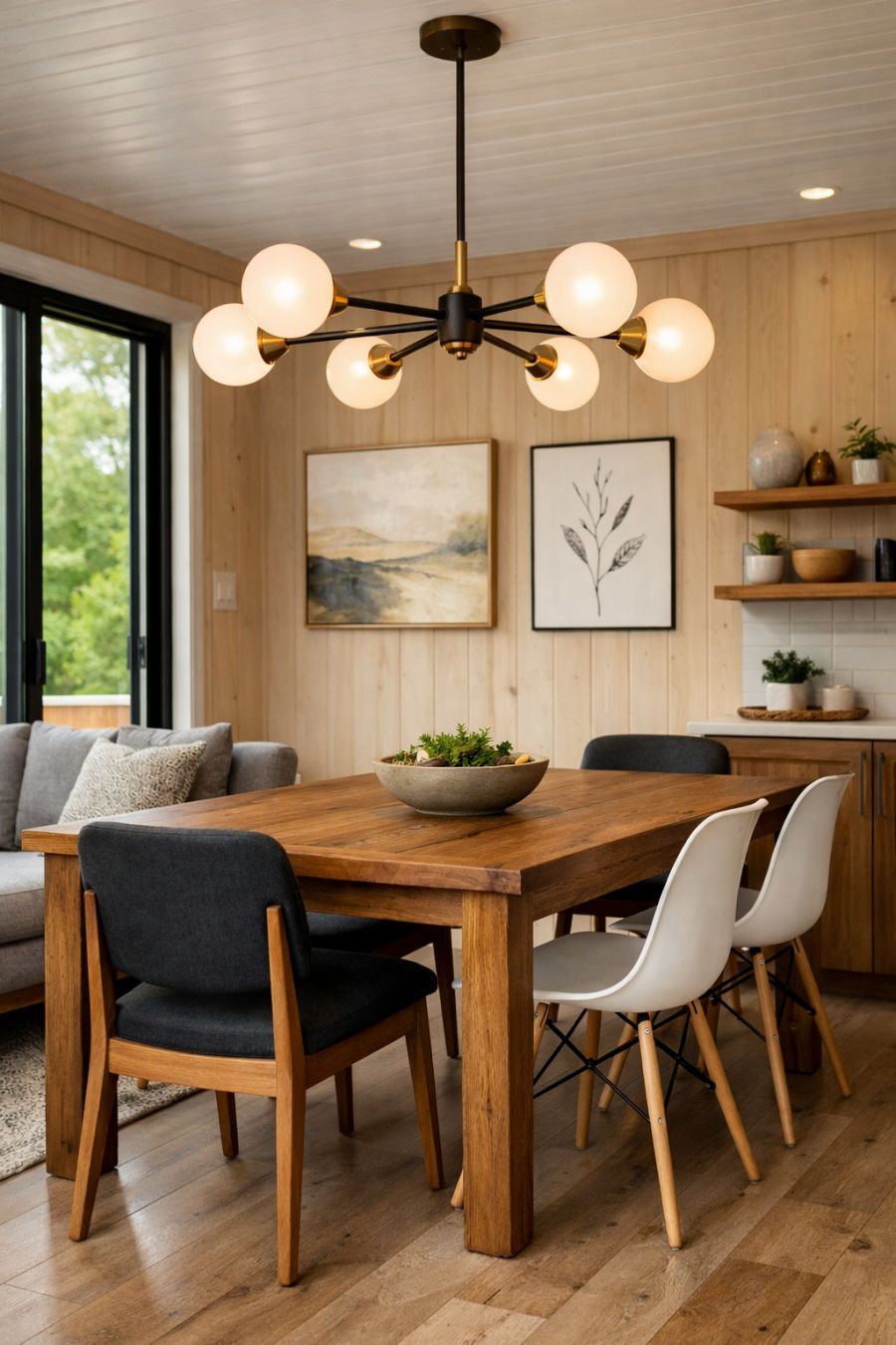 The dining area, seamlessly integrated with the living space, is designed with both form and function in mind. A sturdy wooden table serves as the focal point, surrounded by sleek chairs that offer a nod to mid-century modern aesthetics. Above the table, a statement lighting fixture casts a warm glow, creating an intimate setting for family meals or entertaining guests. The walls are adorned with subtle artwork that complements the neutral color palette, while the large windows ensure the space remains bright and airy throughout the day. The overall design encourages a sociable atmosphere, perfect for memorable dining experiences.