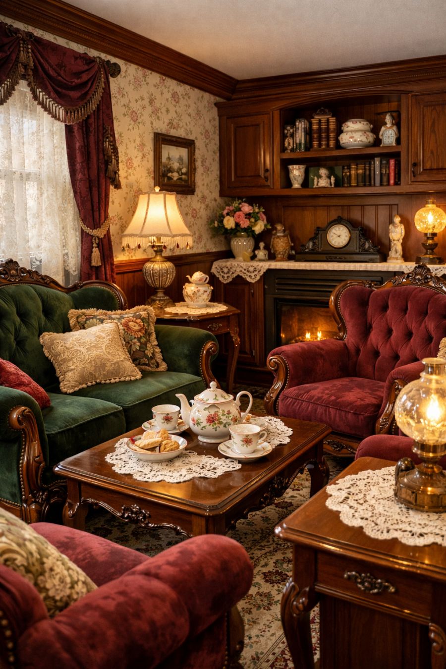Stepping inside, you're transported into a cozy, sophisticated haven reminiscent of a Victorian tea room. The living area is adorned with plush velvet furniture that invites you to sink in and relax. Lace doilies are delicately placed on side tables, adding an extra layer of elegance and attention to detail. Ornate wooden accents and vintage-inspired wallpaper create a warm and inviting atmosphere, perfect for unwinding with a good book or entertaining guests with an afternoon tea.