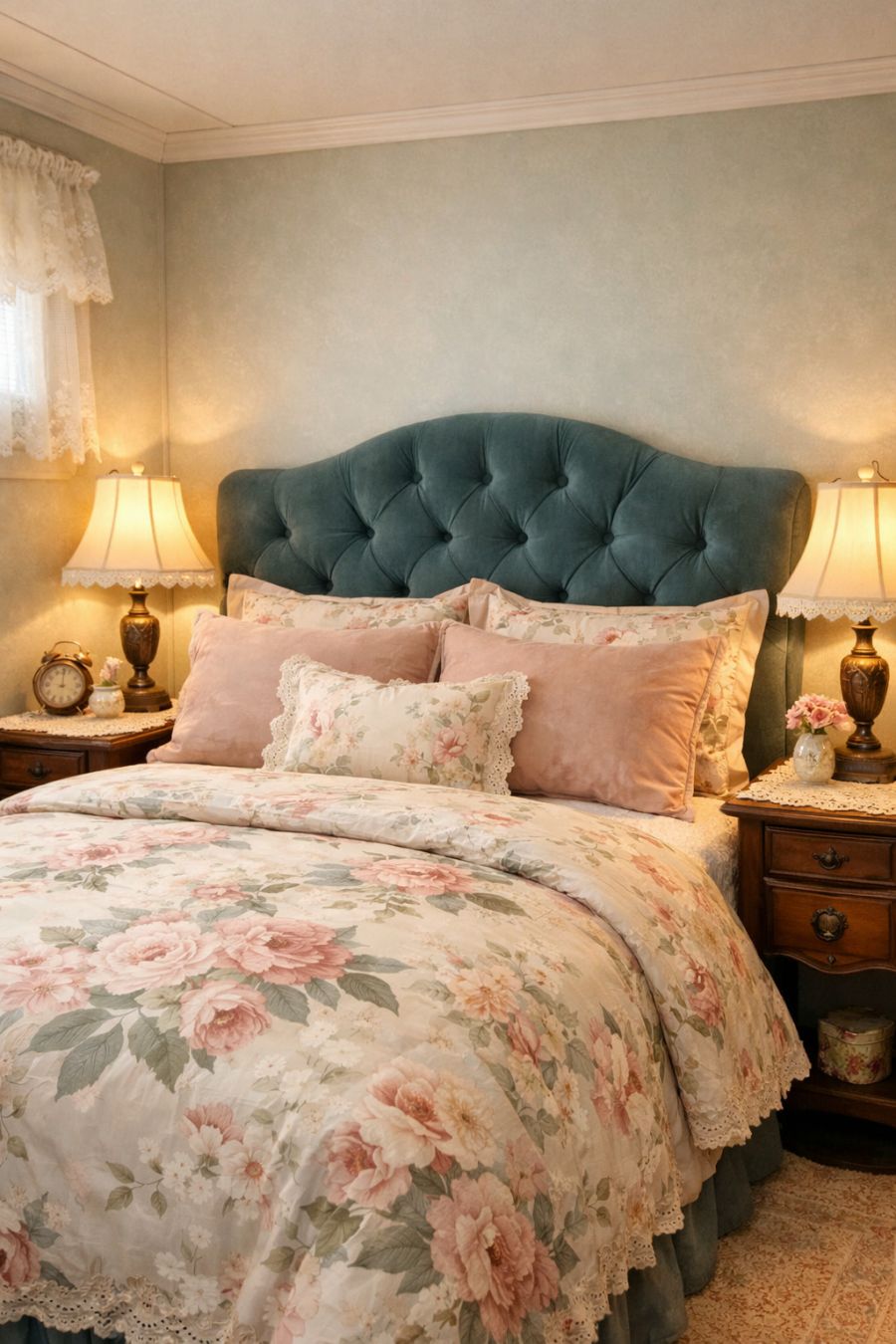 The bedroom is a sanctuary of comfort and style, featuring a plush bed adorned with a luxurious velvet headboard. Soft, floral-patterned bedding adds a touch of femininity and grace. Antique wooden nightstands with lace doilies hold elegant lamps, casting a soft, inviting light. The walls are painted in soothing pastel hues, creating a serene environment that encourages restful sleep and relaxation.
