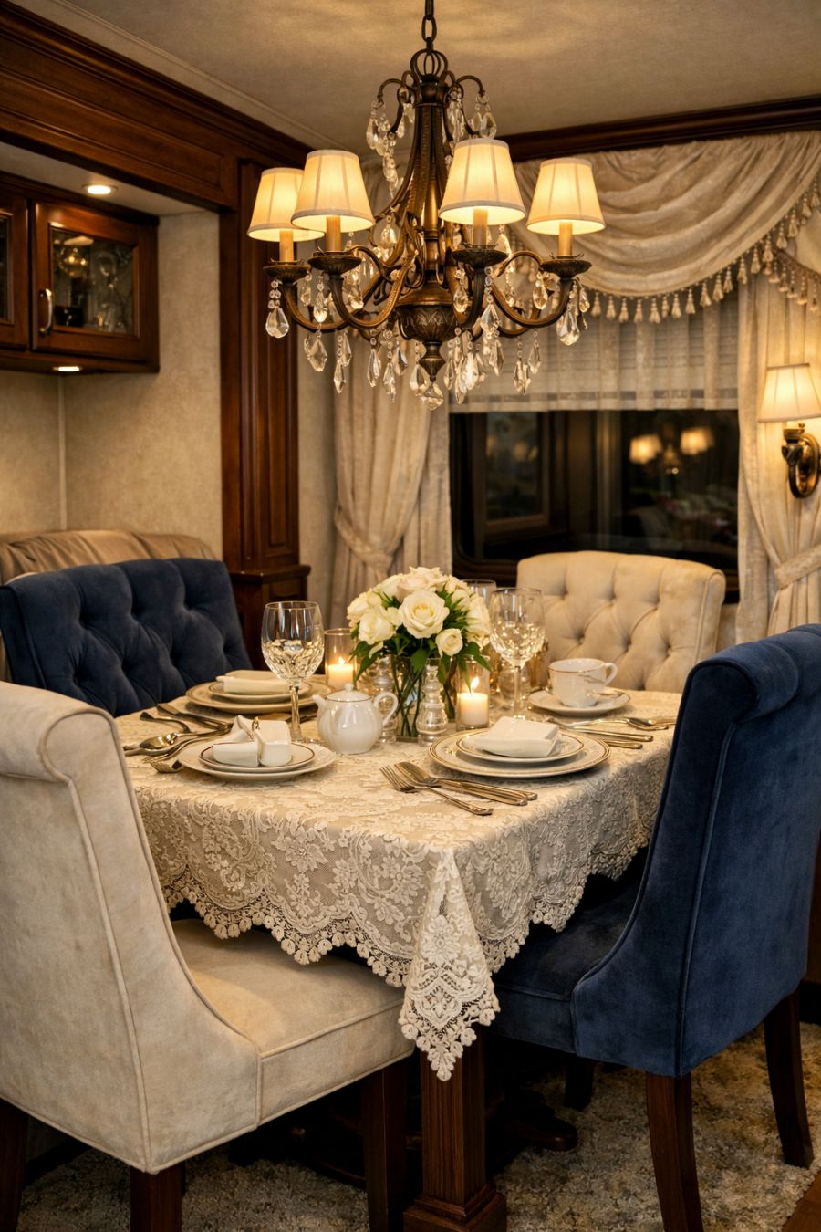 The dining area continues the theme of refined elegance, with a small yet exquisite table set for a charming meal. Velvet-cushioned chairs surround the table, offering both comfort and style. A lace tablecloth, paired with fine china and crystal glassware, sets the stage for intimate dinners or leisurely breakfasts. Soft lighting from an antique chandelier casts a warm glow, enhancing the overall ambiance and making every meal feel like a special occasion.