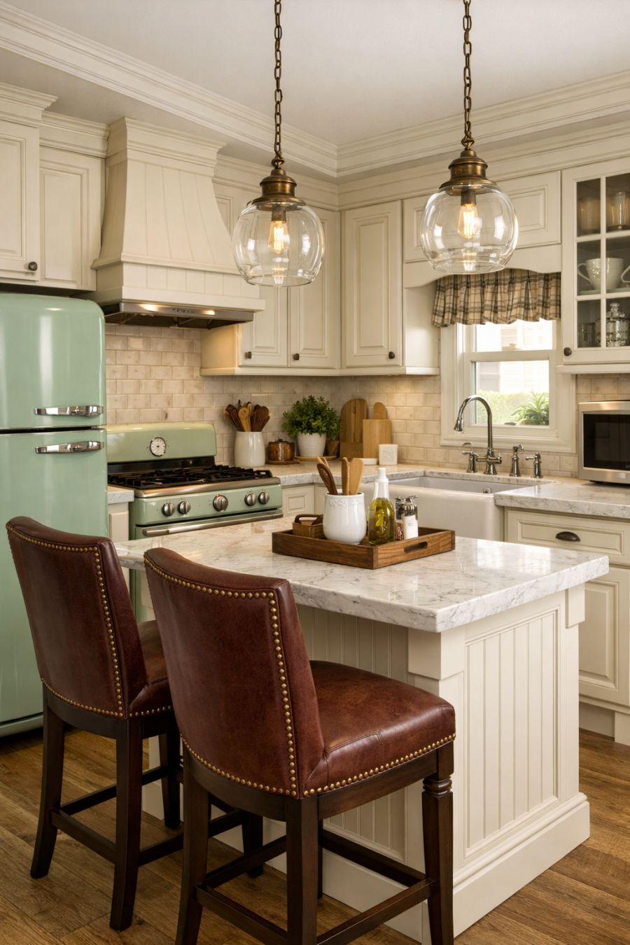 In the kitchen, modern convenience meets classic style. Cream-colored cabinetry with intricate detailing provides ample storage, while marble countertops offer a touch of luxury. Vintage-inspired appliances, such as a retro refrigerator and oven, blend seamlessly with the overall aesthetic. A small, elegant kitchen island serves as both a functional workspace and a place to gather, complete with high-backed stools upholstered in rich fabric.